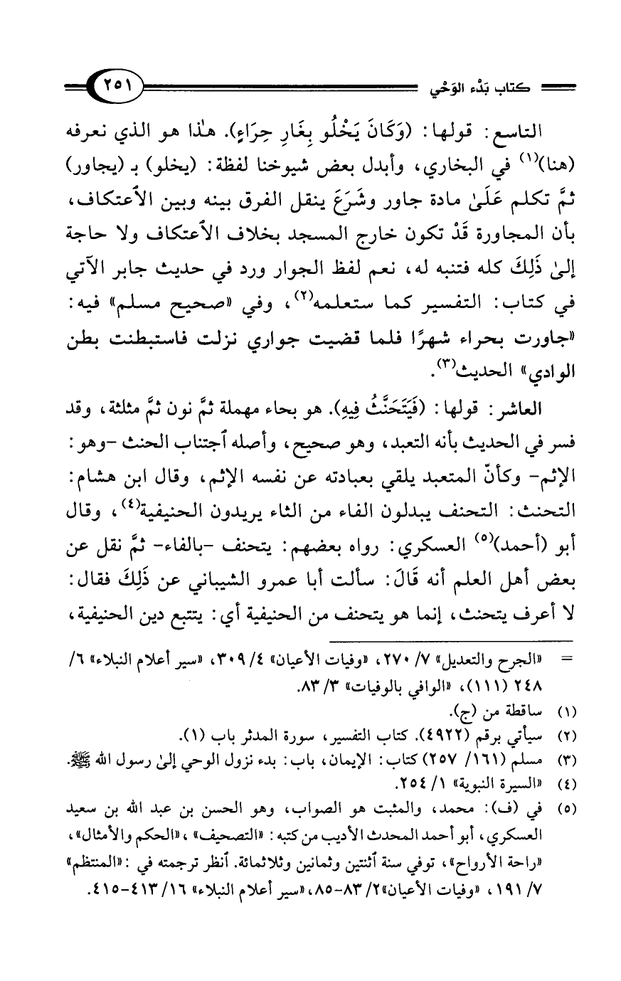 التاسع: قولها: (وَكَانَ يَخْلُو بِغَارِ حِرَاءٍ). هذا هو الذي نعرفه (هنا) (¬1) في البخاري، وأبدل بعض شيوخنا لفظة: (يخلو) بـ (يجاور) ثمَّ تكلم عَلَى مادة جاور وشَرَعَ ينقل الفرق بينه وبين الاعتكاف، بأن المجاورة قَدْ تكون خارج المسجد بخلاف الآعتكاف ولا حاجة إلى ذَلِكَ كله فتنبه له، نعم لفظ الجوار ورد في حديث جابر الآتي في كتاب: التفسير كما ستعلمه (¬2)، وفي "صحيح مسلم" فيه: "جاورت بحراء شهرًا فلما قضيت جواري نزلت فاستبطنت بطن الوادي" الحديث (¬3).