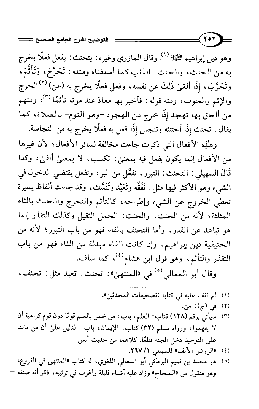 وهذِه الأفعال التي ذكرت جاءت مخالفة لسائر الأفعال؛ لأن غيرها من الأفعال إنما يكون بفعل فيه بمعنى: تكسب، لا بمعنى ألقى، وكذا قَالَ السهيلي: التحنث: التبرر، تفعُّل من البر، وتفعل يقتضي الدخول في الشيء وهو الأكثر فيها مثل: تَفَقَّه وتَعَبَّد وتَنَسَّك، وقد جاءت ألفاظ يسيرة تعطي الخروج عن الشيء وإطراحه، كالتأثم والتحرج والتحنث بالثاء المثلثة؛ لأنه من الحنث، والحنث: الحمل الثقيل وكذلك التقذر إنما هو تباعد عن القذر، وأما التحنف بالفاء فهو من باب التبرر؛ لأنه من الحنيفية دين إبراهيم، وإن كانت الفاء مبدلة من الثاء فهو من باب التقذر والتأثم، وهو قول ابن هشام (¬4)، كما سلف.