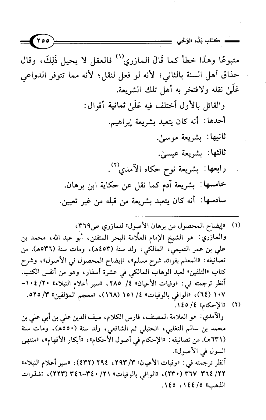(¬1) "إيضاح المحصول من برهان الأصول" للمازري ص 369، والمازري: هو الشيخ الإمام العلَّامة البحر المتفنن، أبو عبد الله، محمد بن علي بن عمر التميمي، المالكي، ولد سنة (453 هـ)، ومات سنة (536 هـ). من تصانيفه: "المعلم بفوائد شرح مسلم"، "إيضاح المحصول في الأصول"، وشرح كتاب "التلقين" لعبد الوهاب المالكي في عشرة أسفار، وهو من أنفس الكتب.