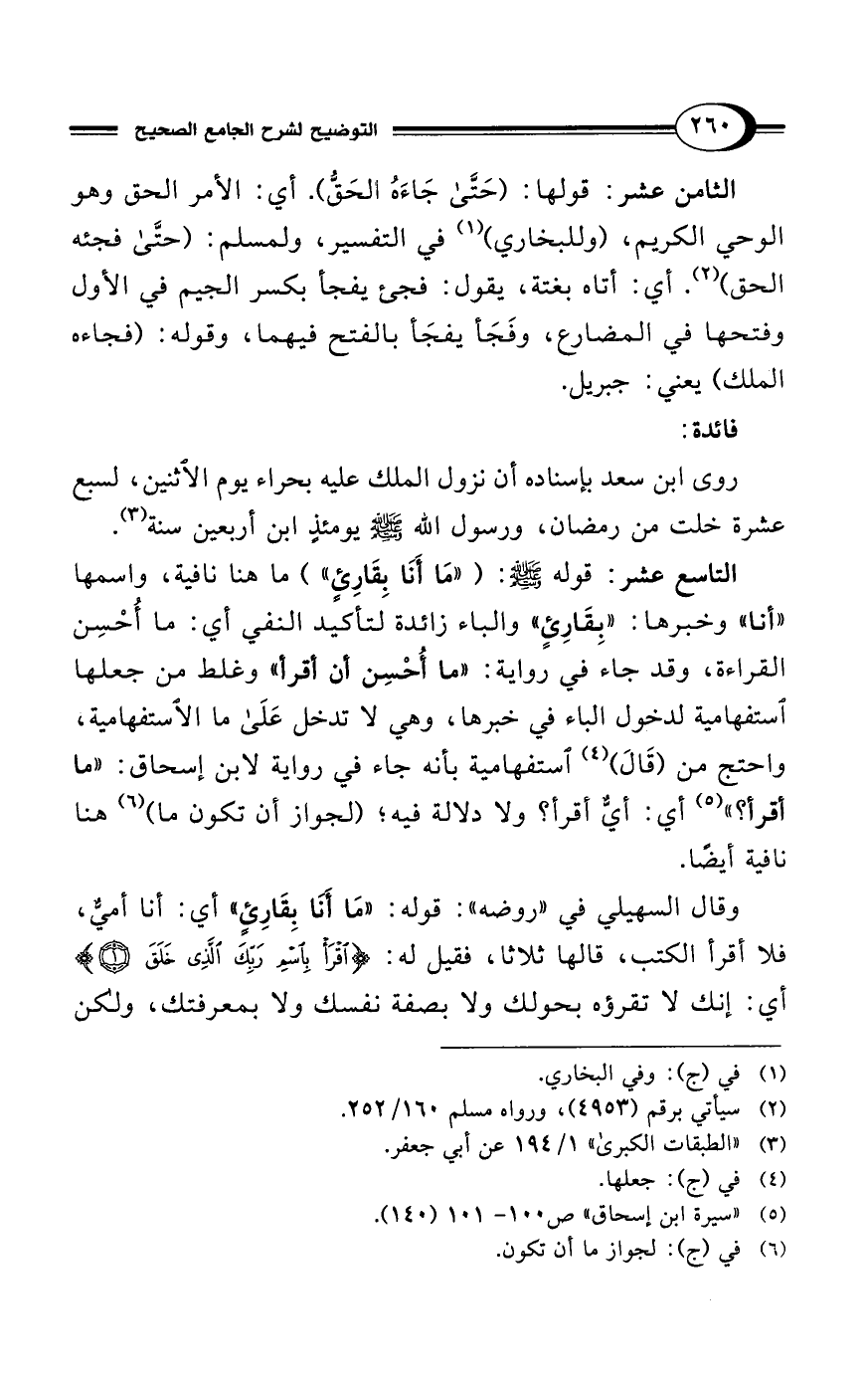 التاسع عشر: قوله - صلى الله عليه وسلم -: ("مَا أَنَا بِقَارِئٍ") ما هنا نافية، واسمها "أنا" وخبرها: "بِقَارِئٍ" والباء زائدة لتأكيد النفي أي: ما أُحْسِن القراءة، وقد جاء في رواية: "ما أُحْسِن أن أقرأ" وغلط من جعلها استفهامية لدخول الباء في خبرها، وهي لا تدخل عَلَى ما الاستفهامية، واحتج من (قَالَ) (¬4) استفهامية بأنه جاء في رواية لابن إسحاق: "ما أقرأ؟ " (¬5) أي: أيٌّ أقرأ؟ ولا دلالة فيه؛ (لجواز أن تكون ما) (¬6) هنا نافية أيضًا.