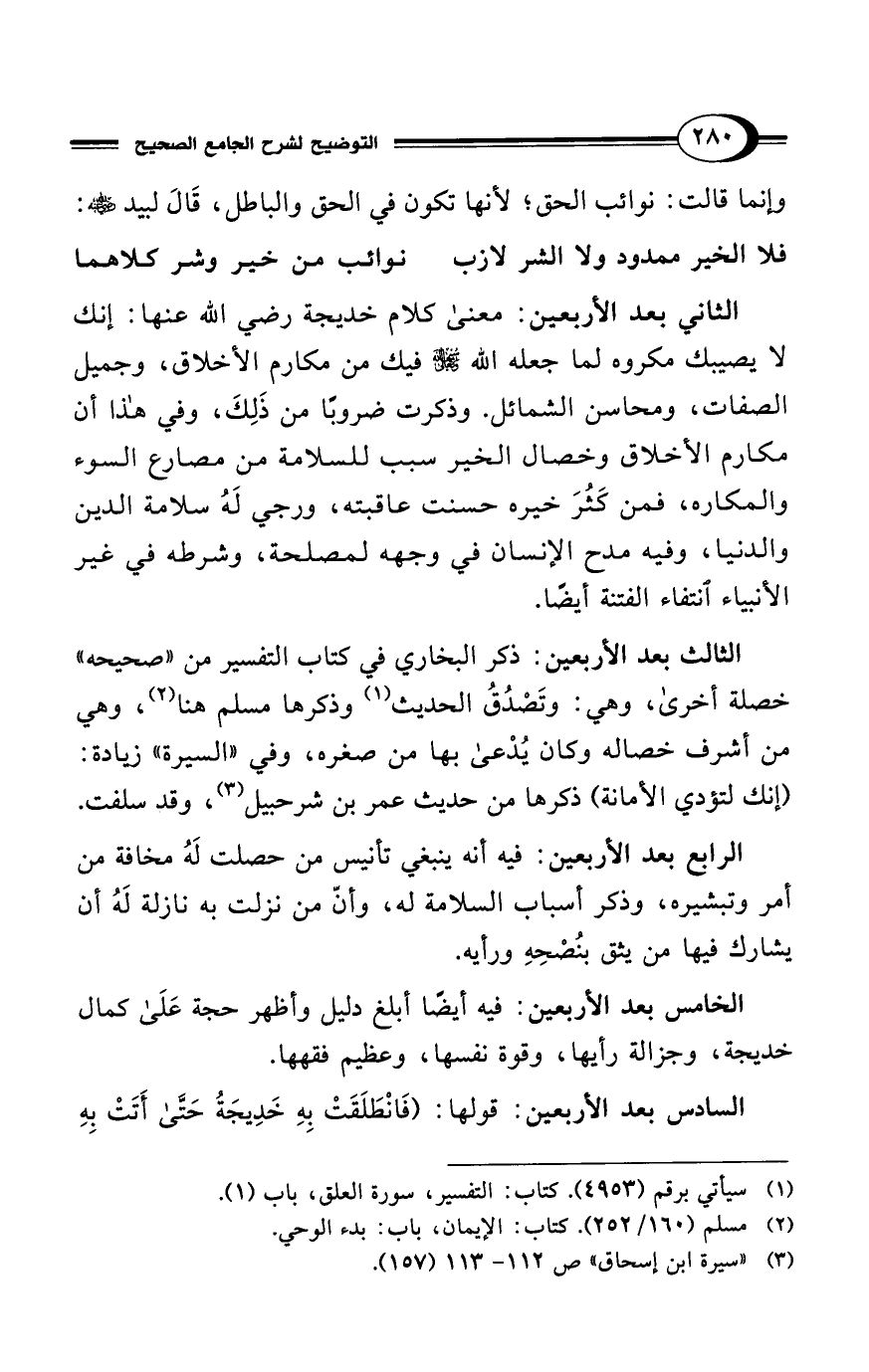 الثاني بعد الأربعين: معنى كلام خديجة رضي الله عنها: إنك لا يصيبك مكروه لما جعله الله -سبحانه وتعالى- فيك من مكارم الأخلاق، وجميل الصفات، ومحاسن الشمائل. وذكرت ضروبًا من ذَلِكَ، وفي هذا أن مكارم الأخلاق وخصال الخير سبب للسلامة من مصارع السوء والمكاره، فمن كَثُرَ خيره حسنت عاقبته، ورجي لَهُ سلامة الدين والدنيا، وفيه مدح الإنسان في وجهه لمصلحة، وشرطه في غير الأنبياء انتفاء الفتنة أيضًا.