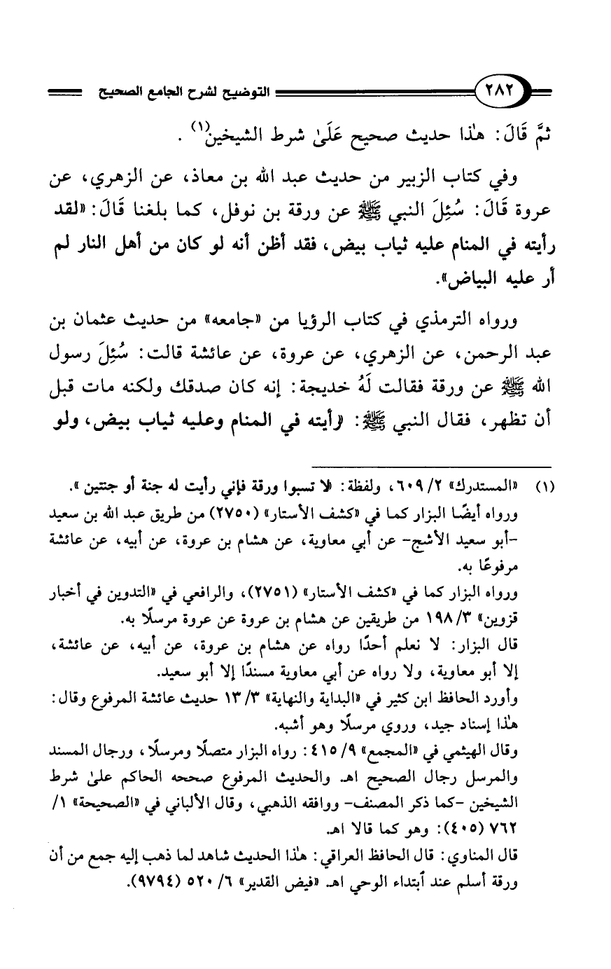 ورواه الترمذي في كتاب الرؤيا من "جامعه" من حديث عثمان بن عبد الرحمن، عن الزهري، عن عروة، عن عائشة قالت: سُئِلَ رسول الله - صلى الله عليه وسلم - عن ورقة فقالت لَهُ خديجة: إنه كان صدقك ولكنه مات قبل أن تظهر، فقال النبي - صلى الله عليه وسلم -: "رأيته في المنام وعليه ثياب بيض، ولو