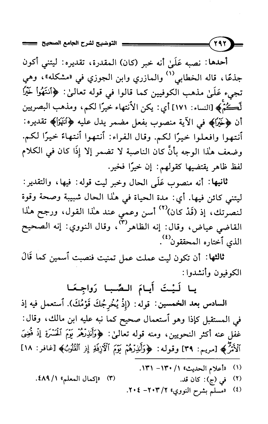 ثانيها: أنه منصوب عَلَى الحال وخبر ليت قوله: فيها، والتقدير: ليتني كائن فيها. أي: مدة الحياة في هذا الحال شبيبة وصحة وقوة لنصرتك، إذ (قَدْ كان) (¬2) أسن وعمي عند هذا القول، ورجح هذا القاضي عياض، وقال: إنه الظاهر (¬3)، وقال النووي: إنه الصحيح الذي اختاره المحققون (¬4).