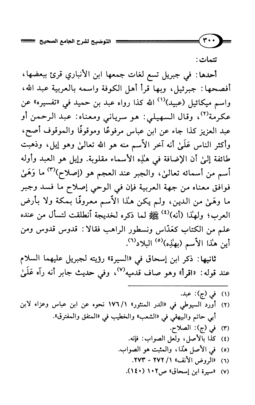 أحدها: في جبريل تسع لغات جمعها ابن الأنباري قرى ببعضها، أفصحها: جبرئيل، وبها قرأ أهل الكوفة واسمه بالعربية عبد الله، واسم ميكائيل (عبيد) (¬1) الله كذا رواه عبد بن حميد في "تفسيره" عن عكرمة (¬2)، وقال السهيلي: هو سرياني ومعناه: عبد الرحمن أو عبد العزيز كذا جاء عن ابن عباس مرفوعًا وموقوفًا والموقوف أصح، وأكثر الناس عَلَى أنه آخر الاسم منه هو الله تعالى وهو إيل، وذهبت طائفة إلى أن الإضافة في هذِه الأسماء مقلوبة. وإيل هو العبد وأوله اسم من أسمائه تعالى، والجبر عند العجم هو (إصلاح) (¬3) ما وَهَى فوافق معناه من جهة العربية فإن في الوحي إصلاح ما فسد وجبر ما وهَى من الدين، ولم يكن هذا الاسم معروفًا بمكة ولا بأرض العرب؛ ولهذا (أنه) (¬4) - صلى الله عليه وسلم - لما ذكره لخديجة انطلقت لتسأل من عنده علم من الكتاب كعَدّاس ونسطور الراهب فقالا: قدوس قدوس ومن أين هذا الاسم (بهذِه) (¬5) البلاد (¬6).