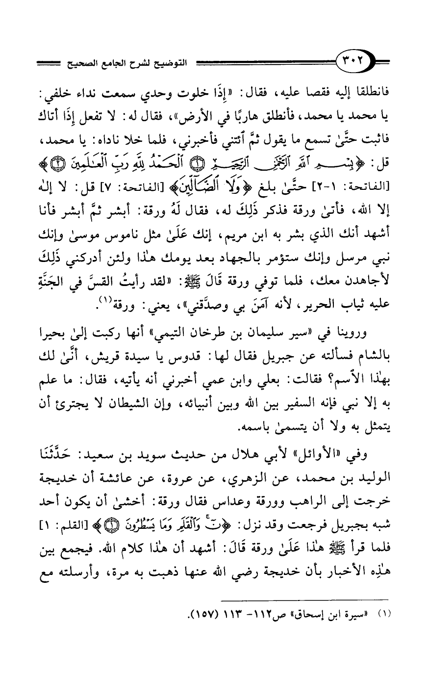 فانطلقا إليه فقصا عليه، فقال: "إِذَا خلوت وحدي سمعت نداء خلفي: يا محمد يا محمد، فأنطلق هاربًا في الأرض"، فقال له: لا تفعل إِذَا أتاك فاثبت حتَّى تسمع ما يقول ثمَّ ائتني فأخبرني، فلما خلا ناداه: يا محمد، قل: {بِسْمِ اللهِ الرَّحْمَنِ الرَّحِيمِ (1) الْحَمْدُ لِلَّهِ رَبِّ الْعَالَمِينَ (2)} [الفاتحة: 1 - 2] حتَّى بلغ {وَلَا الضَّالِّينَ} [الفاتحة: 7] قل: لا إله إلا الله، فأتى ورقة فذكر ذَلِكَ له، فقال لَهُ ورقة: أبشر ثمَّ أبشر فأنا أشهد أنك الذي بشر به ابن مريم، إنك عَلَى مثل ناموس موسى وإنك نبي مرسل وإنك ستؤمر بالجهاد بعد يومك هذا ولئن أدركني ذَلِكَ لأجاهدن معك، فلما توفي ورقة قَالَ - صلى الله عليه وسلم -: "لقد رأيتُ القسَّ في الجَنَّةِ عليه ثياب الحرير، لأنه آمَنَ بي وصدَّقني"، يعني: ورقة (¬1).