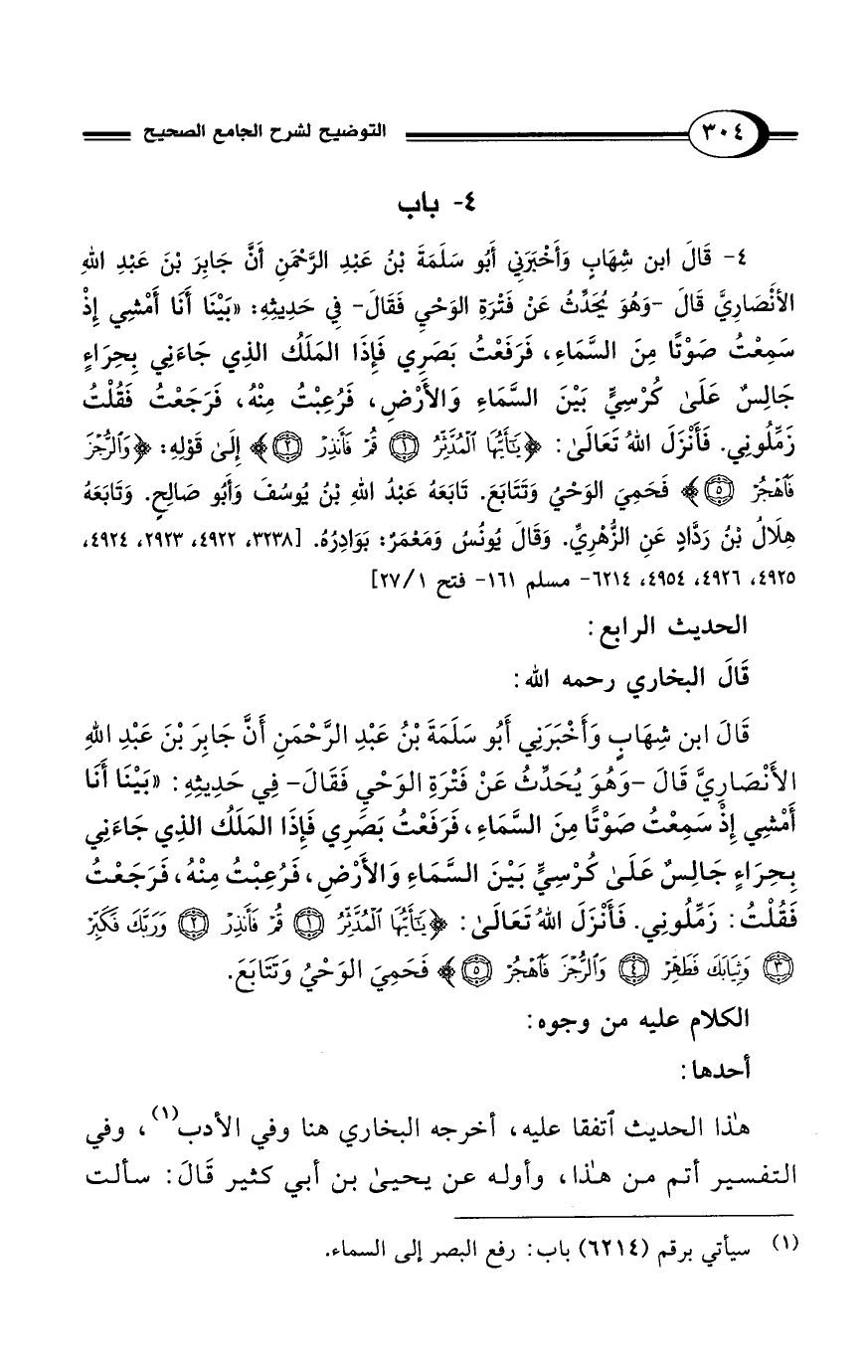 4 - قَالَ ابن شِهَابٍ وَأَخْبَرَنِي أَبُو سَلَمَةَ بْنُ عَبْدِ الرحمن ان جَابِرَ بْنَ عَبْدِ اللهِ الأنصَارِيَّ قَالَ- وَهُوَ يحدث عَنْ فَتْرَةِ الوَحْيِ فَقَالَ- فِي حَدِيثِهِ: "بَيْنَا أَنَا أَمْشِي إِذْ سَمِعْتُ صَوْتًا مِنَ السَّمَاءِ، فَرَفَعْتُ بَصَرِي فَإِذَا المَلَكُ الذِي جَاءَنِي بِحِرَاءٍ جَالِسٌ على كُرْسِيٍّ بَيْنَ السَّمَاءِ وَالأَرْضِ، فَرُعِبْتُ مِنْهُ، فَرَجَعْتُ فَقُلْتُ زَمِّلُونِي. فَأَنْزَلَ اللهُ تَعَالَى: {يَا أَيُّهَا الْمُدَّثِّرُ (1) قُمْ فَأَنْذِرْ (2)} إِلَى قَوْلهِ: {وَالرُّجْزَ فَاهْجُرْ (5)} فَحَمِيَ الوَحْيُ وَتَتَابَعَ. تَابَعَهُ عَبْدُ اللهِ بْنُ يُوسُفَ وَأبو صَالِحِ. وَتَابَعَهُ هِلَالُ بْنُ رَدَّادٍ عَنِ الزُّهْرِيِّ. وَقَالَ يُونُسُ وَمَعْمَر: بَوَادِرُة. [3238، 4922، 2923، 4924، 4925، 4926، 4954، 6214 - مسلم 161 - فتح 1/ 27]