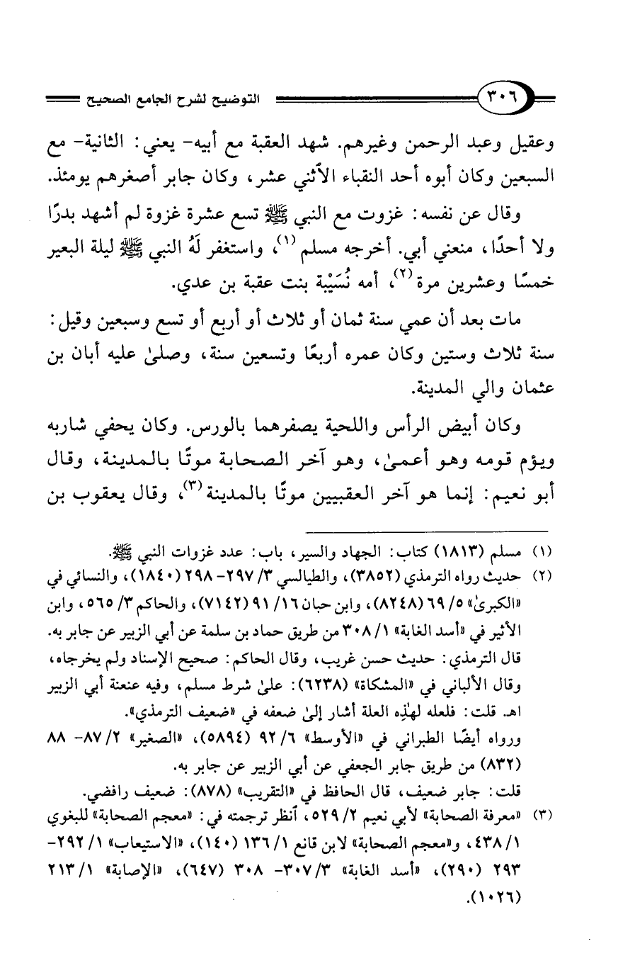 وعقيل وعبد الرحمن وغيرهم. شهد العقبة مع أبيه -يعني: الثانية- مع السبعين وكان أبوه أحد النقباء الاثني عشر، وكان جابر أصغرهم يومئذ.