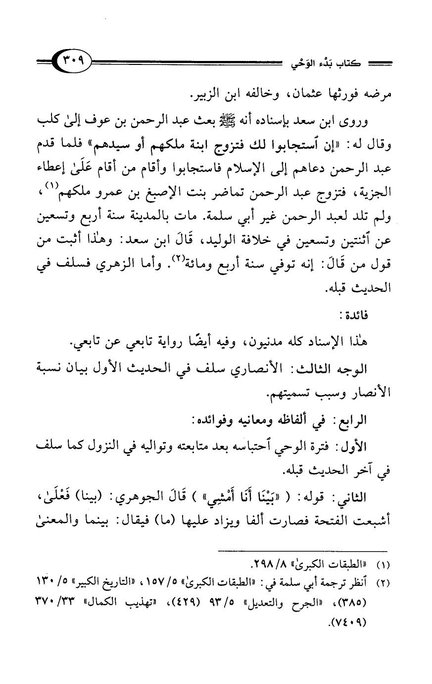 وروى ابن سعد بإسناده أنه - صلى الله عليه وسلم - بعث عبد الرحمن بن عوف إلى كلب وقال له: "إن استجابوا لك فتزوج ابنة ملكهم أو سيدهم" فلما قدم عبد الرحمن دعاهم إلى الإسلام فاستجابوا وأقام من أقام عَلَى إعطاء الجزية، فتزوج عبد الرحمن تماضر بنت الإصبغ بن عمرو ملكهم (¬1)، ولم تلد لعبد الرحمن غير أبي سلمة. مات بالمدينه سنة أربع وتسعين عن اثنتين وتسعين في خلافة الوليد، قَالَ ابن سعد: وهذا أثبت من قول من قَالَ: إنه توفي سنة أربع ومائة (¬2). وأما الزهري فسلف في الحديث قبله.