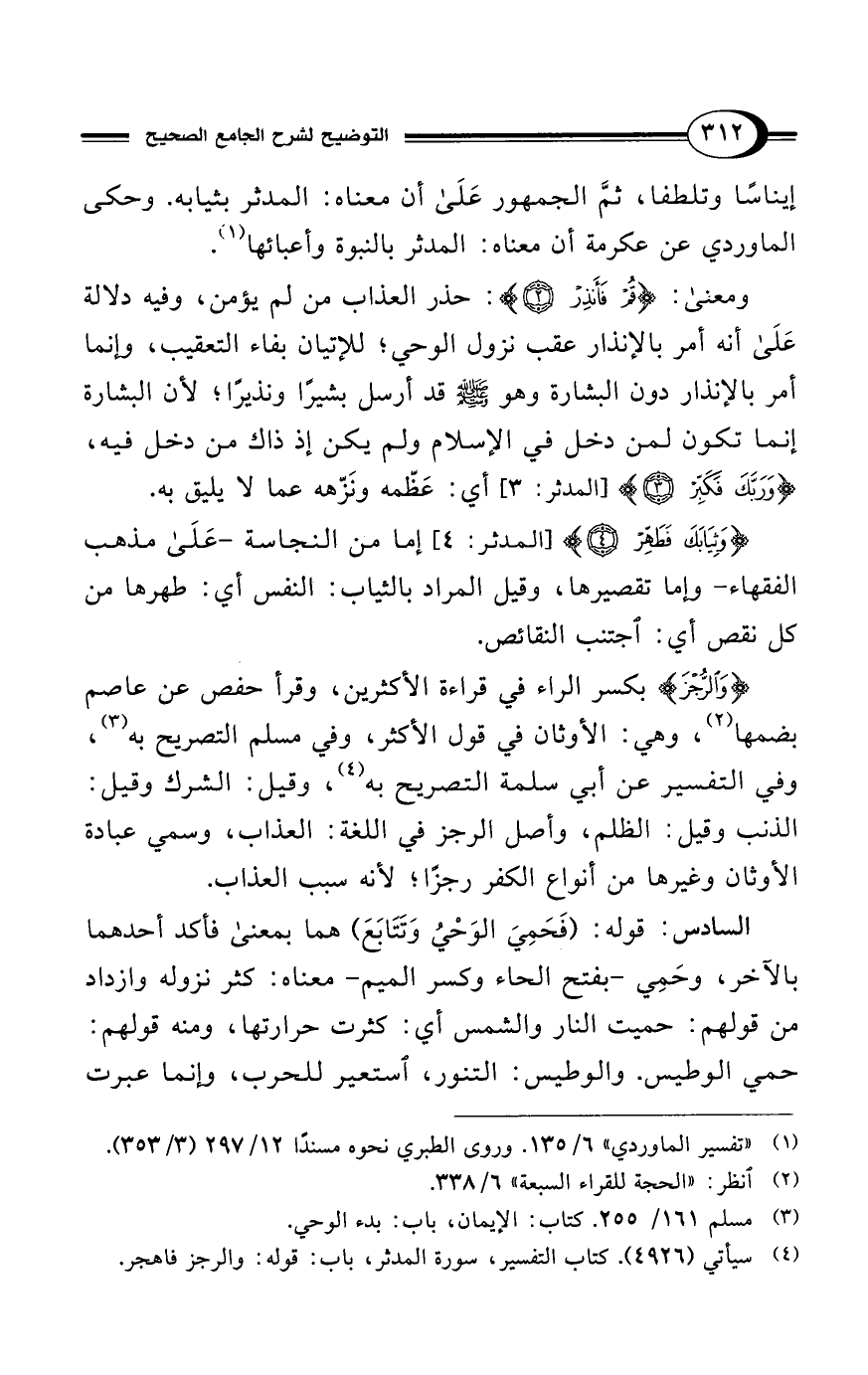 {وَثِيَابَكَ فَطَهِّرْ (4)} [المدثر: 4]، إما من النجاسة -عَلَى مذهب الفقهاء- وإما تقصيرها، وقيل المراد بالثياب: النفس أي: طهرها من كل نقص أي: اجتنب النقائص.
