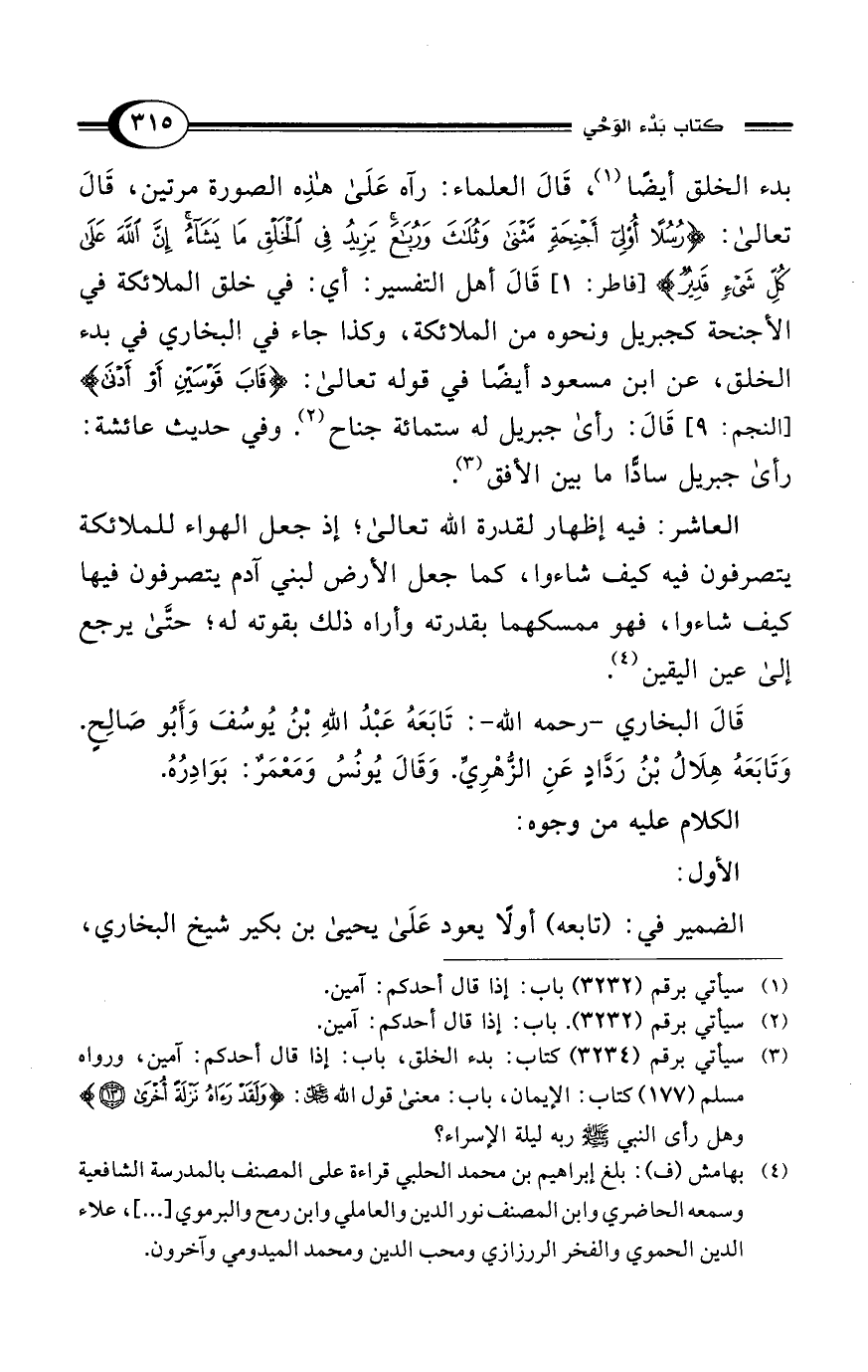 بدء الخلق أيضًا (¬1)، قَالَ العلماء: رآه على هذِه الصورة مرتين، قَالَ تعالى: {رُسُلًا أُولِي أَجْنِحَةٍ مَثْنَى وَثُلَاثَ وَرُبَاعَ يَزِيدُ فِي الْخَلْقِ مَا يَشَاءُ إِنَّ اللَّهَ عَلَى كُلِّ شَيْءٍ قَدِيرٌ} [فاطر: 1] قَاَل اهل التفسير: أى فى خلق الملائكه فى الأجنحة كجبريل ونحوه من الملائكة، وكذا جاء في إلبخاري في بدء الخلق، عن ابن مسعود أيضًا في قوله تعالى: {قَابَ قَوْسَيْنِ أَوْ أَدْنَى} [النجم: 9] قال: رأى جبريل له ستمائة جناح (¬2). وفي حديث عائشة: رأى جبريل سادًّا ما بين الأفق (¬3).