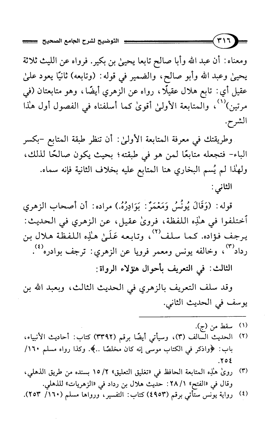 ومعناه: أن عبد الله وأبا صالح تابعا يحيى بن بكير. فرواه عن الليث ثلاثة يحيى وعبد الله وأبو صالح، والضمير في قوله: (وتابعه) ثانيًا يعود على عقيل أي: تابع هلال عقيلًا، رواه عن الزهري أيضًا، وهو متابعتان (في مرتين) (¬1)، والمتابعة الأولى أقوى كما أسلفناه في الفصول أول هذا الشرج.