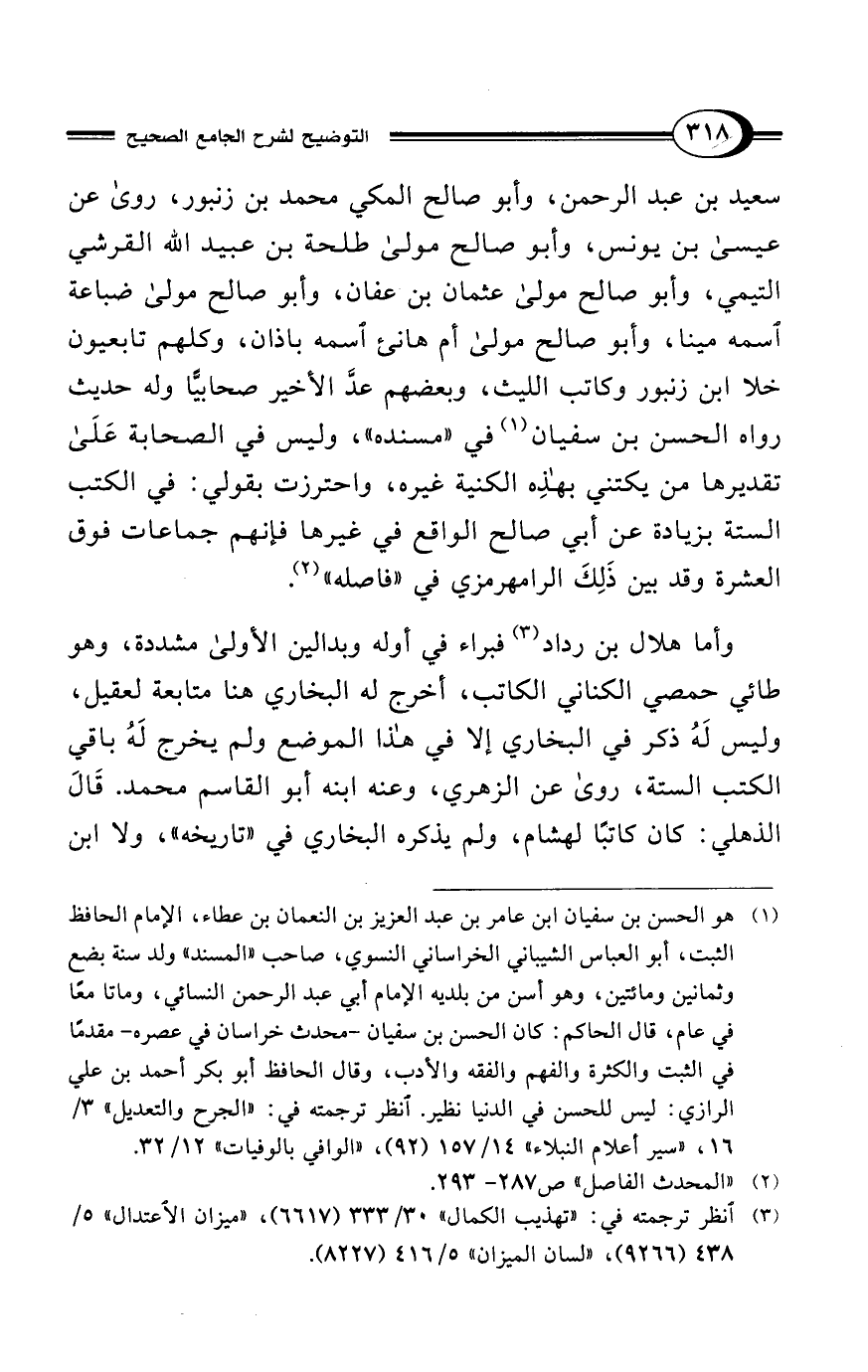 سعيد بن عبد الرحمن، وأبو صالح المكي محمد بن زنبور، روى عن عيسى بن يونس، وأبو صالح مولى طلحة بن عبيد الله القرشي التيمي، وأبو صالح مولى عثمان بن عفان، وأبو صالح مولى ضباعة اسمه مينا، وأبو صالح مولى أم هانى اسمه باذان، وكلهم تابعيون خلا ابن زنبور وكاتب الليث، وبعضهم عدَّ الأخير صحابيًّا وله حديث رواه الحسن بن سفيان (¬1) في "مسنده"، وليس في الصحابة على تقديرها من يكتني بهذِه الكنية غيره، واحترزت بقولي: في الكتب الستة بزيادة عن أبي صالح الواقع في غيرها فإنهم جماعات فوق العشرة وقد بين ذَلِكَ الرامهرمزي في "فاصله" (¬2).