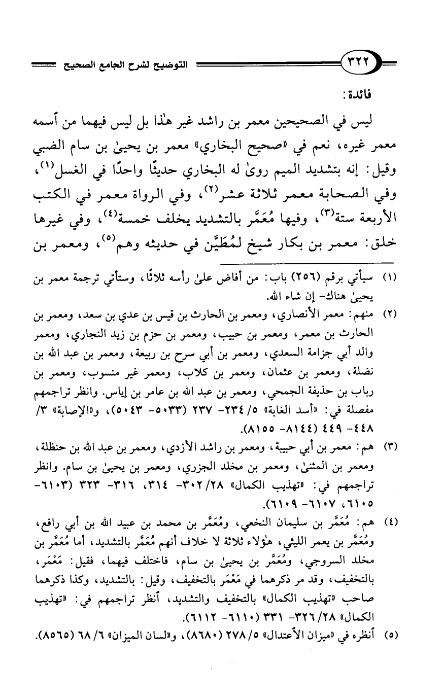 ليس في الصحيحين معمر بن راشد غير هذا بل ليس فيهما من اسمه معمر غيره، نعم في "صحيح البخاري" معمر بن يحيى بن سام الضبي وقيل: إنه بتشديد الميم روى له البخاري حديثًا واحدًا في الغسل (¬1)، وفي الصحابة معمر ثلاثة عشر (¬2)، وفي الرواة معمر في الكتب الأربعة ستة (¬3)، وفيها مُعَمَّر بالتشديد يخلف خمسة (¬4)، وفي غيرها خلق: معمر بن بكار شيخ لمُطَيَّن في حديثه وهم (¬5)، ومعمر بن