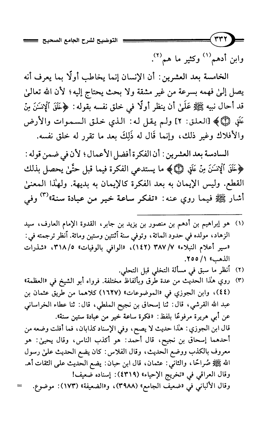 (¬3) روي هذا الحديث من عدة طرق وبألفاظ مختلفة. فرواه أبو الشيخ في "العظمة" (44)، وابن الجوزي في "الموضوعات" (1627) كلاهما من طريق عثمان بن عبد الله القرشي، قال: ثنا إسحاق بن نجيح الملطي، قال: ثنا عطاء الخراساني عن أبي هريرة مرفوعًا بلفظ: "فكرة ساعة خير من عبادة ستين سنة".