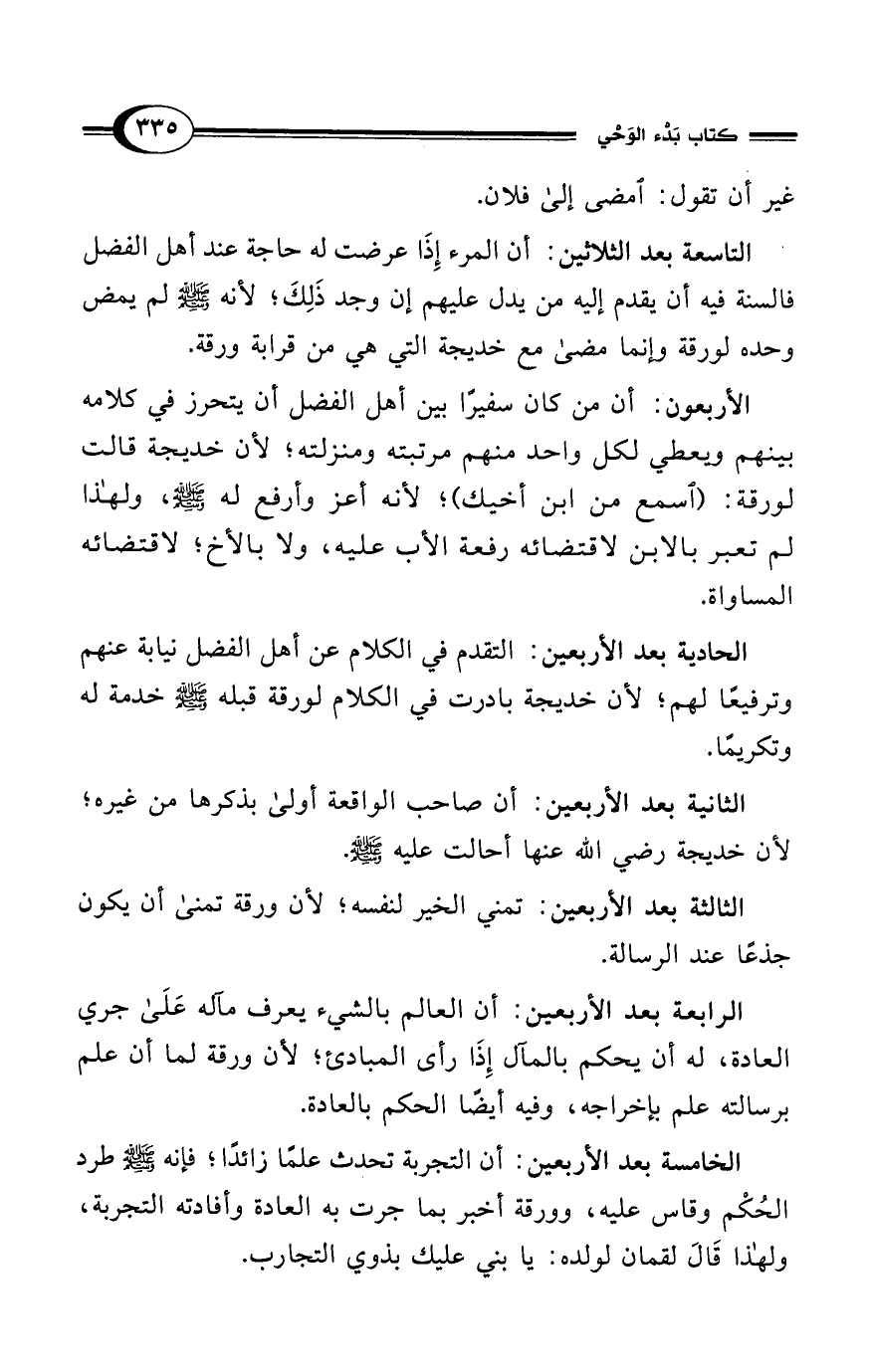 الأربعون: أن من كان سفيرًا بين أهل الفضل أن يتحرز في كلامه بينهم ويعطي لكل واحد منهم مرتبته ومنزلته؛ لأن خديجة قالت لورقة: (اسمع من ابن أخيك)؛ لأنه أعز وأرفع له - صلى الله عليه وسلم -، ولهذا لم تعبر بالابن لاقتضائه رفعة الأب عليه، ولا بالأخ؛ لاقتضائه المساواة.