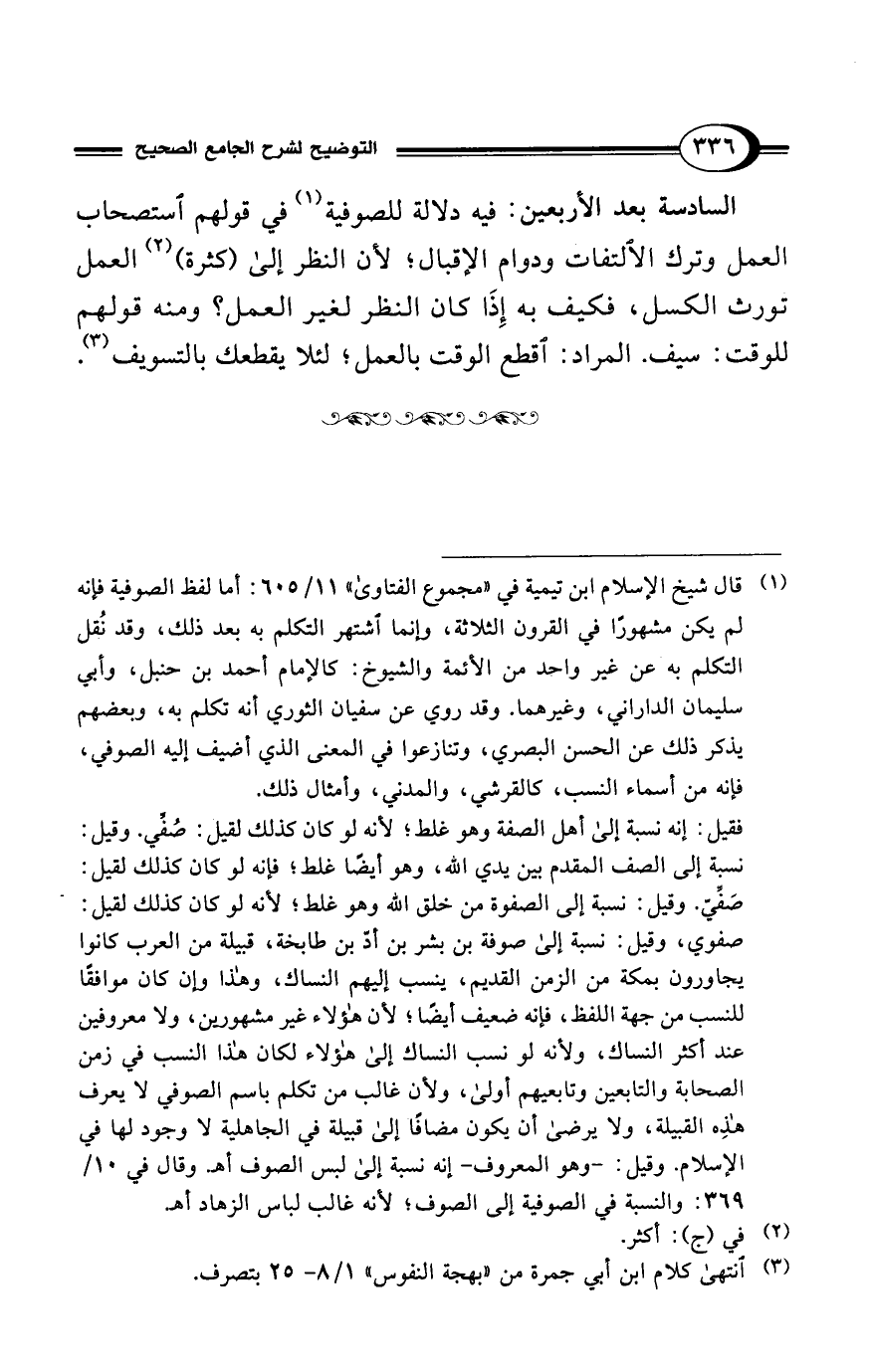(¬1) قال شيخ الإسلام ابن تيمية في "مجموع الفتاوى" 11/ 605: أما لفظ الصوفية فإنه لم يكن مشهورًا في القرون الثلاثة، وإنما اشتهر التكلم به بعد ذلك، وقد نُقل التكلم به عن غير واحد من الأئمة والشيوخ: كالإمام أحمد بن حنبل، وأبي سليمان الداراني، وغيرهما. وقد روي عن سفيان الثوري أنه تكلم به، وبعضهم يذكر ذلك عن الحسن البصري، وتنازعوا في المعنى الذي أضيف إليه الصوفي، فإنه من أسماء النسب، كالقرشي، والمدني، وأمثال ذلك.