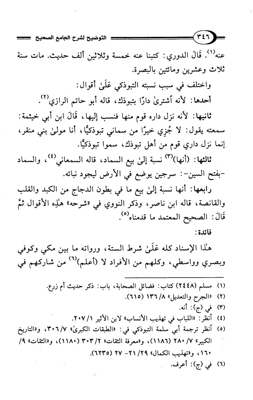 ثانيها: لأنه نزل داره قوم منها فنسب إليها، قَالَ ابن أبي خيثمة: سمعته يقول: لا جُزِي خيرًا من سماني تبوذكيًّا، أنا مولى بني منقر، إنما نزل داري قوم من أهل تبوذك، سموا تبوذكيًّا.