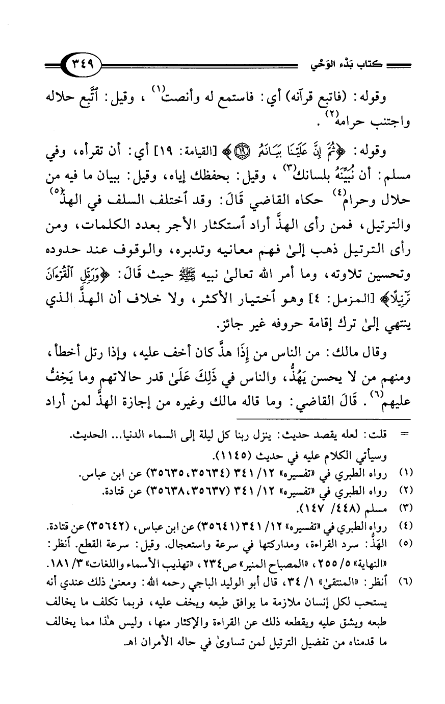 وقوله: {ثُمَّ إِنَّ عَلَيْنَا بَيَانَهُ (19)} [القيامة: 19]، أي: أن تقرأه، وفي مسلم: أن نُبَيِّنَهُ بلسانك (¬3)، وقيل: بحفظك إياه، وقيل: ببيان ما فيه من حلال وحرام (¬4) حكاه القاضي قَالَ: وقد اختلف السلف في الهذَّ (¬5) والترتيل، فمن رأى الهذَّ أراد استكثار الأجر بعدد الكلمات، ومن رأى الترتيل ذهب إلى فهم معانيه وتدبره، والوقوف عند حدوده وتحسين تلاوته، وما أمر الله تعالى نبيه - صلى الله عليه وسلم - حيث قَالَ: {وَرَتِّلِ الْقُرْآنَ تَرْتِيلًا} [المزمل: 4] وهو اختيار الأكثر، ولا خلاف أن الهذَّ الذي ينتهي إلى ترك إقامة حروفه غير جائز.