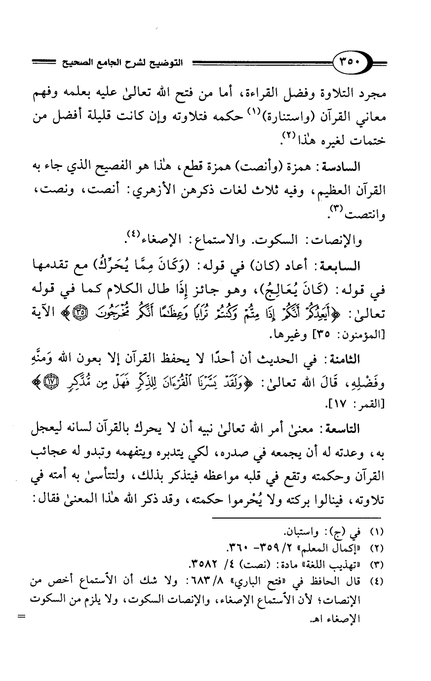 السادسة: همزة (وأنصت) همزة قطع، هذا هو الفصيح الذي جاء به القرآن العظيم، وفيه ثلاث لغات ذكرهن الأزهري: أنصت، ونصت، وانتصت (¬3).