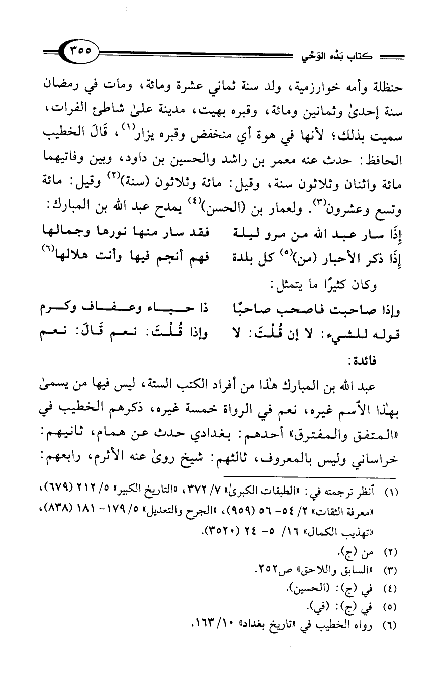 حنظلة وأمه خوارزمية، ولد سنة ثماني عشرة ومائة، ومات في رمضان سنة إحدى وثمانين ومائة، وقبره بهيت، مدينة على شاطئ الفرات، سميت بذلك؛ لأنها في هوة أي منخفض وقبره يزار (¬1)، قَالَ الخطيب الحافظ: حدث عنه معمر بن راشد والحسين بن داود، وبين وفاتيهما مائة واثنان وثلاثون سنة، وقيل: مائة وثلاثون (سنة) (¬2) وقيل: مائة وتسع وعشرون (¬3). ولعمار بن (الحسن) (¬4) يمدح عبد الله بن المبارك: