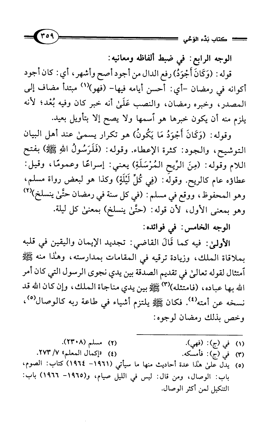 الأولى: فيه كما قَالَ القاضي: تجديد الإيمان واليقين في قلبه بملاقاة الملك، وزيادة ترقيه في المقامات بمدارسته، وهذا منه - صلى الله عليه وسلم - امتثال لقوله تعالى في تقديم الصدقة بين يدي نجوى الرسول التي كان أمر الله بها عباده، (فامتثله) (¬3) - صلى الله عليه وسلم - بين يدي مناجاة الملك، وإن كان الله قد نسخه عن أمته (¬4). فكان - صلى الله عليه وسلم - يلتزم أشياء في طاعة ربه كالوصال (¬5)، وخص بذلك رمضان لوجوه: