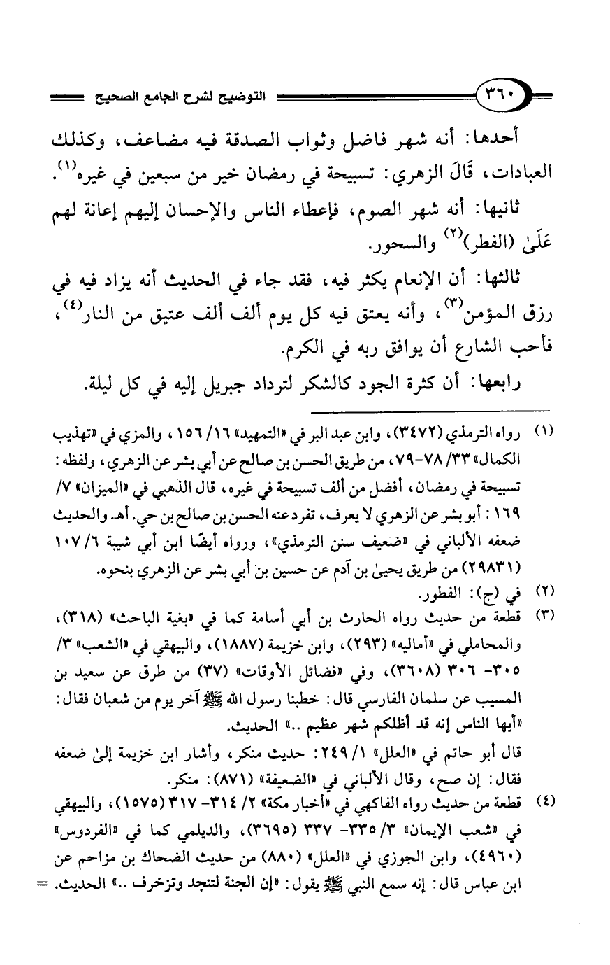 (¬1) رواه الترمذي (3472)، وابن عبد البر في "التمهيد" 16/ 156، والمزي في "تهذيب الكمال" 33/ 78 - 79، من طريق الحسن بن صالح عن أبي بشر عن الزهري، ولفظه: تسبيحة في رمضان، أفضل من ألف تسبيحة في غيره، قال الذهبي في "الميزان" 7/ 169: أبو بشر عن الزهري لا يعرف، تفرد عنه الحسن بن صالح بن حي. أهـ. والحديث ضعفه الألباني في "ضعيف سنن الترمذي"، ورواه أيضًا ابن أبي شيبة 6/ 107 (29831) من طريق يحيى بن آدم عن حسين بن أبي بشر عن الزهري بنحوه.
