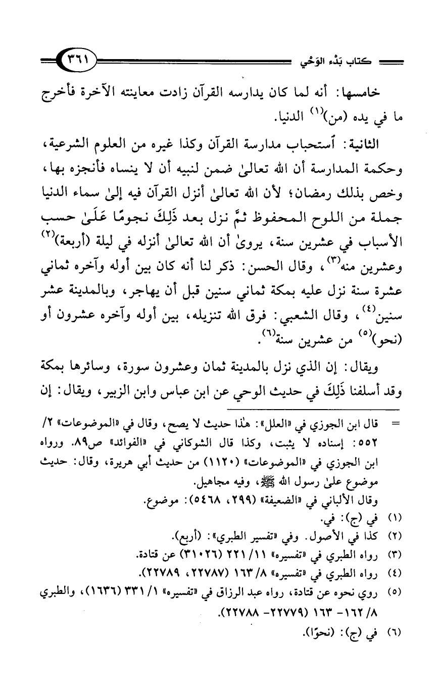 الثانية: استحباب مدارسة القرآن وكذا غيره من العلوم الشرعية، وحكمة المدارسة أن الله تعالى ضمن لنبيه أن لا ينساه فأنجزه بها، وخص بذلك رمضان؛ لأن الله تعالى أنزل القرآن فيه إلى سماء الدنيا جملة من اللوح المحفوظ ثمَّ نزل بعد ذَلِكَ نجومًا عَلَى حسب الأسباب في عشرين سنة، يروى أن الله تعالى أنزله في ليلة (أربعة) (¬2) وعشرين منه (¬3)، وقال الحسن: ذكر لنا أنه كان بين أوله وآخره ثماني عشرة سنة نزل عليه بمكة ثماني سنين قبل أن يهاجر، وبالمدينة عشر سنين (¬4)، وقال الشعبي: فرق الله تنزيله، بين أوله وآخره عشرون أو (نحو) (¬5) من عشرين سنة (¬6).