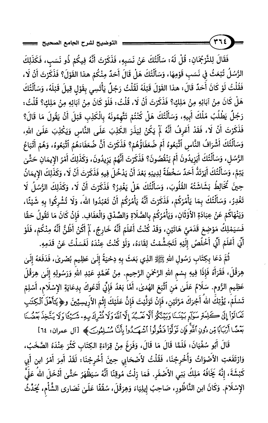 ثُمَّ دَعَا بِكِتَابِ رَسُولِ اللهِ - صلى الله عليه وسلم - الَّذِى بَعَثَ بِهِ دِحْيَةُ إِلَى عَظِيمِ بُصْرَى، فَدَفَعَهُ إِلَى هِرَقْلَ، فَقَرَأَهُ فَإِذَا فِيهِ بِسْمِ اللهِ الرَّحْمَنِ الرَّحِيمِ. مِنْ مُحَمَّدٍ عَبْدِ اللهِ وَرَسُولِهِ إِلَى هِرَقْلَ عَظِيمِ الرُّومِ. سَلاَمٌ عَلَى مَنِ اتَّبَعَ الْهُدَى، أَمَّا بَعْدُ فَإِنِّى أَدْعُوكَ بِدِعَايَةِ الإِسْلاَمِ، أَسْلِمْ تَسْلَمْ، يُؤْتِكَ اللهُ أَجْرَكَ مَرَّتَيْنِ، فَإِنْ تَوَلَّيْتَ فَإِنَّ عَلَيْكَ إِثْمَ الأَرِيسِيِّينَ وَ {قُلْ يَا أَهْلَ الْكِتَابِ تَعَالَوْا إِلَى كَلِمَةٍ سَوَاءٍ بَيْنَنَا وَبَيْنَكُمْ أَلَّا نَعْبُدَ إِلَّا اللَّهَ وَلَا نُشْرِكَ بِهِ شَيْئًا وَلَا يَتَّخِذَ بَعْضُنَا بَعْضًا أَرْبَابًا مِنْ دُونِ اللَّهِ فَإِنْ تَوَلَّوْا فَقُولُوا اشْهَدُوا بِأَنَّا مُسْلِمُونَ} [آل عمران: 64]