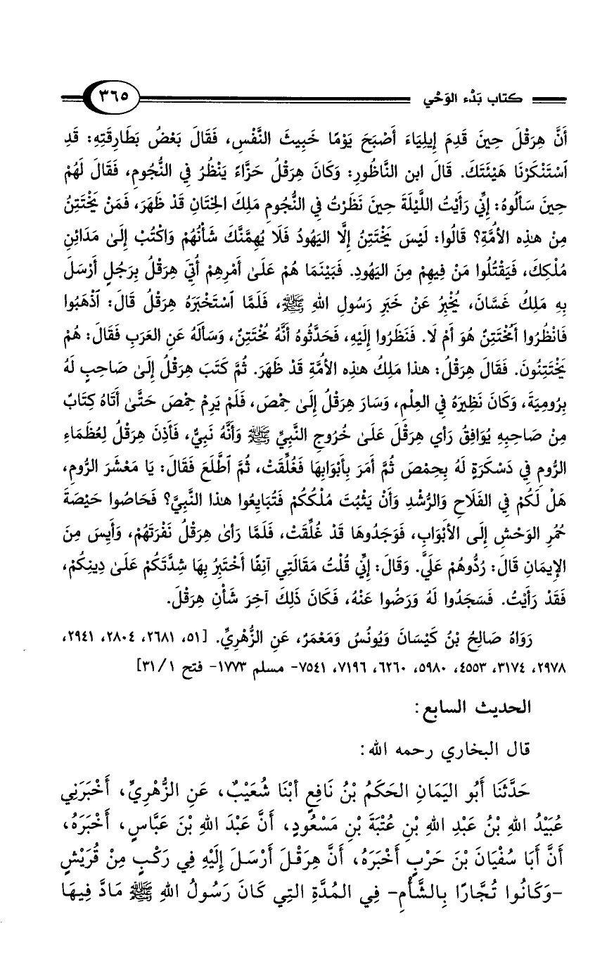 أَنَّ هِرَقْلَ حِينَ قَدِمَ إِيلِيَاءَ أَصْبَحَ يَوْمًا خَبِيثَ النَّفْسِ، فَقَالَ بَعْضُ بَطَارِقَتِهِ: قَدِ اسْتَنْكَرْنَا هَيْئَتَكَ. قَالَ ابْنُ النَّاظُورِ: وَكَانَ هِرَقْلُ حَزَّاءً يَنْظُرُ فِى النُّجُومِ، فَقَالَ لَهُمْ حِينَ سَأَلُوهُ: إِنِّى رَأَيْتُ اللَّيْلَةَ حِينَ نَظَرْتُ فِى النُّجُومِ مَلِكَ الْخِتَانِ قَدْ ظَهَرَ، فَمَنْ يَخْتَتِنُ مِنْ هَذِهِ الأُمَّةِ؟ قَالُوا: لَيْسَ يَخْتَتِنُ إِلاَّ الْيَهُودُ فَلاَ يُهِمَّنَّكَ شَأْنُهُمْ وَاكْتُبْ إِلَى مَدَايِنِ مُلْكِكَ، فَيَقْتُلُوا مَنْ فِيهِمْ مِنَ الْيَهُودِ. فَبَيْنَمَا هُمْ عَلَى أَمْرِهِمْ أُتِىَ هِرَقْلُ بِرَجُلٍ أَرْسَلَ بِهِ مَلِكُ غَسَّانَ، يُخْبِرُ عَنْ خَبَرِ رَسُولِ اللهِ - صلى الله عليه وسلم -، فَلَمَّا اسْتَخْبَرَهُ هِرَقْلُ قَالَ: اذْهَبُوا فَانْظُرُوا أَمُخْتَتِنٌ هُوَ أَمْ لاَ. فَنَظَرُوا إِلَيْهِ، فَحَدَّثُوهُ أَنَّهُ مُخْتَتِنٌ، وَسَأَلَهُ عَنِ الْعَرَبِ فَقَالَ: هُمْ يَخْتَتِنُونَ. فَقَالَ هِرَقْلُ: هَذَا مَلِكُ هَذِهِ الأُمَّةِ قَدْ ظَهَرَ. ثُمَّ كَتَبَ هِرَقْلُ إِلَى صَاحِبٍ لَهُ بِرُومِيَةَ، وَكَانَ نَظِيرَهُ فِى الْعِلْمِ، وَسَارَ هِرَقْلُ إِلَى حِمْصَ، فَلَمْ يَرِمْ حِمْصَ حَتَّى أَتَاهُ كِتَابٌ مِنْ صَاحِبِهِ يُوَافِقُ رَأْىَ هِرَقْلَ عَلَى خُرُوجِ النَّبِىِّ - صلى الله عليه وسلم - وَأَنَّهُ نَبِىٌّ، فَأَذِنَ هِرَقْلُ لِعُظَمَاءِ الرُّومِ فِى دَسْكَرَةٍ لَهُ بِحِمْصَ ثُمَّ أَمَرَ بِأَبْوَابِهَا فَغُلِّقَتْ، ثُمَّ اطَّلَعَ فَقَالَ: يَا مَعْشَرَ الرُّومِ، هَلْ لَكُمْ فِى الْفَلاَحِ وَالرُّشْدِ وَأَنْ يَثْبُتَ مُلْكُكُمْ فَتُبَايِعُوا هَذَا النَّبِيَّ؟ فَحَاصُوا حَيْصَةَ حُمُرِ الْوَحْشِ إِلَى الأَبْوَابِ، فَوَجَدُوهَا قَدْ غُلِّقَتْ، فَلَمَّا رَأَى هِرَقْلُ نَفْرَتَهُمْ، وَأَيِسَ مِنَ الإِيمَانِ قَالَ: رُدُّوهُمْ عَلَىَّ. وَقَالَ: إِنِّى قُلْتُ مَقَالَتِي آنِفًا أَخْتَبِرُ بِهَا شِدَّتَكُمْ عَلَى دِينِكُمْ، فَقَدْ رَأَيْتُ. فَسَجَدُوا لَهُ وَرَضُوا عَنْهُ، فَكَانَ ذَلِكَ آخِرَ شَأْنِ هِرَقْلَ.