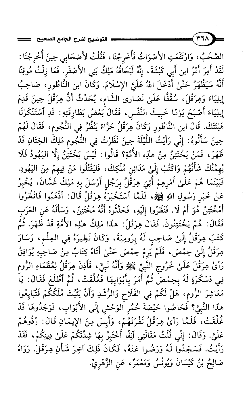 الصَّخَبُ، وَارْتَفَعَتِ الأَصْوَاتُ فَأُخْرِجْنَا، فَقُلْتُ لأَصْحَابِي حِينَ أُخْرِجْنَا: لَقَدْ أَمِرَ أَمْرُ ابن أَبِي كَبْشَةَ، إِنَّهُ لَيَخَافُهُ مَلِكُ بني الأَصْفَرِ. فَمَا زِلْتُ مُوقِنًا أَنَّهُ سَيَظْهَرُ حَتَّى أَدْخَلَ اللهُ عَلَيَّ الإِسْلَامَ. وَكَانَ ابن النَّاطُورِ، صَاحِبُ إِيلِيَاءَ وَهِرَقْلَ، سُقُفًّا عَلَى نَصَارى الشَّامِ، يُحَدثُ أَنَّ هِرَقْلَ حِينَ قَدِمَ إِيلِيَاءَ أَصْبَحَ يَوْمَا خَبِيثَ النَّفْسِ، فَقَالَ بَعْضُ بَطَارِقَتِهِ: قَدِ اسْتَنْكَرْنَا هَيْئَتَكَ. قَالَ ابن النَّاطُورِ وَكَانَ هِرَقْلُ حَزَّاءَ يَنْظُرُ فِي النُّجُومِ، فَقَالَ لَهُمْ حِينَ سَأَلُوهُ: إِنِّي رَأَيْتُ اللَّيْلَةَ حِينَ نَظَرْتُ فِي النُّجُومِ مَلِكَ الخِتَانِ قَدْ ظَهَرَ، فَمَنْ يَخْتَتِنُ مِنْ هذِه الأُمَّةِ؟ قَالُوا: لَيْسَ يَخْتَتِنُ إِلَّا اليَهُودُ فَلَا يُهِمَّنَّكَ شَأْنُهُمْ وَاكْتُبْ إِلَى مَدَائِنِ مُلْكِكَ، فَليَقْتُلُوا مَنْ فِيهِمْ مِنَ اليَهُودِ. فَبَيْنَمَا هُمْ على أَمْرِهِمْ أُتِيَ هِرَقْلُ بِرَجُلِ أَرْسَلَ بِهِ مَلِكُ غَسَّانَ، يُخْبِرُ عَنْ خَبَرِ رَسُولِ اللهِ - صلى الله عليه وسلم -، فَلَمَّا اسْتَخْبَرَهُ هِرَقْلُ قَالَ: اذْهَبُوا فَانْظُرُوا أَمُخْتَتِنٌ هُوَ أَمْ لَا. فَنَظَرُوا إِلَيْهِ، فَحَدَّثُوهُ أَنَّهُ مُخْتَتِنٌ، وَسَأَلَهُ عَنِ العَرَبِ فَقَالَ: هُمْ يَخْتَتِنُونَ. فَقَالَ هِرَقْلُ: هذا مَلِكُ هذِه الأُمَّةِ قَدْ ظَهَرَ. ثُمَّ كَتَبَ هِرَقْلُ إِلَى صَاحِبِ لَهُ بِرُومِيَةَ، وَكَانَ نَظِيرَهُ فِي العِلْمِ، وَسَارَ هِرَقْلُ إلى حِمْصَ، فَلَمْ يَرِمْ حِمْصَ حَتَّى أَتَاهُ كِتَابٌ مِنْ صَاحِبِهِ يُوَافِقُ رَأى هِرَقْلَ عَلَى خرُوجِ النَّبِيِّ - صلى الله عليه وسلم - وأَنَّهُ نَبِيٌّ، فَأَذِنَ هِرَقْلُ لِعُظَمَاءِ الرُّومِ فِي دَسْكَرَةٍ لَهُ بِحِمْصَ ثُمَّ أَمَرَ بِأَبْوَابِهَا فَغُلِّقَتْ، ثُمَّ اطَّلَعَ فَقَالَ: يَا مَعَاشِرَ الرُّومِ، هَلْ لَكُمْ فِي الفَلَاحِ وَالرُّشْدِ وَأَنْ يَثْبُتَ مُلْكُكُمْ فَتُبَايِعُوا هذا النَّبِيَّ؟ فَحَاصوا حَيْصَةَ حُمُرِ الوَحْشِ إِلَى الأَبْوَابِ، فَوَجَدُوهَا قَدْ غُلِّقَتْ، فَلَمَّا رَأى هِرَقْلُ نَفْرَتَهُمْ، وَأَيِسَ مِنَ الإِيمَانِ قَالَ: رُدُّوهُمْ عَلَيَّ. وَقَالَ: إِنِّي قُلْتُ مَقَالَتِي آنِفًا أَخْتَبِرُ بِهَا شِدَّتَكُمْ على دِينِكُمْ، فَقَدْ رَأَيْتُ. فَسَجَدُوا لَهُ وَرَضُوا عَنْهُ، فَكَانَ ذَلِكَ آخِرَ شَأْنِ هِرَقْلَ. رَوَاهُ صَالِحُ بْنُ كَيْسَانَ وُيونُسُ وَمَعْمَرٌ، عَنِ الزُّهْرِيِّ.