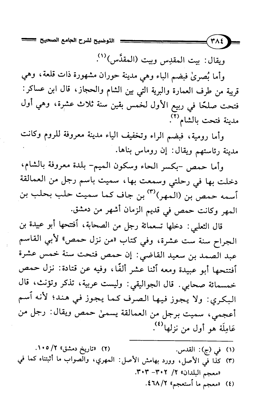 قال الثعلبي: دخلها تسعمائة رجل من الصحابة، افتتحها أبو عييدة بن الجراح سنة ست عشرة، وفي كتاب "من نزل حمص" لأبي القاسم عبد الصمد بن سعيد القاضي: إن حمص فتحت سنة خمس عشرة افتتحها أبو عبيدة ومعه اثنا عشر ألفًا، وفيه عن قتادة: نزل حمص خمسمائة صحابي. قال الجواليقي: وليست عربية، تذكر وتؤنث، قال البكري: ولا يجوز فيها الصرف كما يجوز في هند؛ لأنه اسم أعجمي، سميت برجل من العمالقة يسمى حمص ويقال: رجل من عَامِلَة هو أول من نزلها (¬4).
