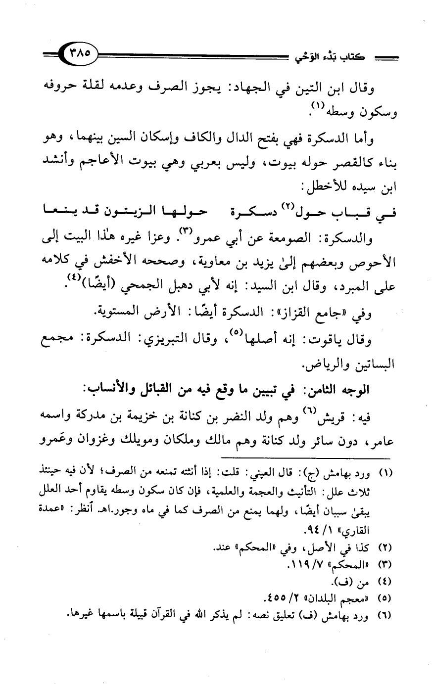 (¬1) ورد بهامش (ج): قال العيني: قلت: إذا أنثته تمنعه من الصرف؛ لأن فيه حينئذ ثلاث علل: التأنيث والعجمة والعلمية، فإن كان سكون وسطه يقاوم أحد العلل يبقى سببان أيضًا، ولهما يمنع من الصرف كما في ماه وجور. اهـ. انظر: "عمدة القاري" 1/ 94.