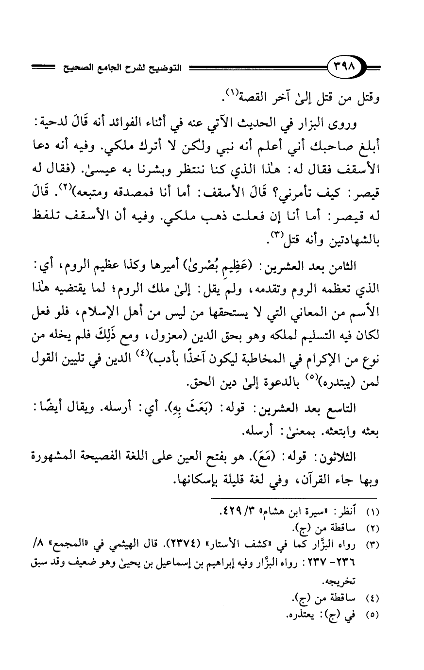 الثامن بعد العشرين: (عَظِيمِ بُصْرى) أميرها وكذا عظيم الروم، أي: الذي تعظمه الروم وتقدمه، ولم يقل: إلى ملك الروم؛ لما يقتضيه هذا الاسم من المعاني التي لا يستحقها من ليس من أهل الإسلام، فلو فعل لكان فيه التسليم لملكه وهو بحق الدين (معزول، ومع ذَلِكَ فلم يخله من نوع من الإكرام في المخاطبة ليكون آخذًا بأدب) (¬4) الدين في تليين القول لمن (يبتدره) (¬5) بالدعوة إلى دين الحق.