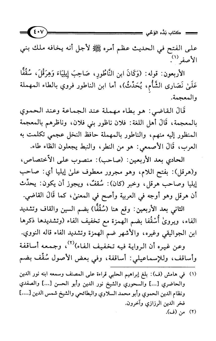 الأربعون: قوله: (وَكَانَ ابن النَّاطُورِ، صَاحِبَ إِيلِيَاءَ وَهِرَقْلَ، سُقُفًّا عَلَى نَصَارى الشَأْمِ، يُحَدِّثُ)، أما ابن الناطور فروي بالطاء المهملة والمعجمة.