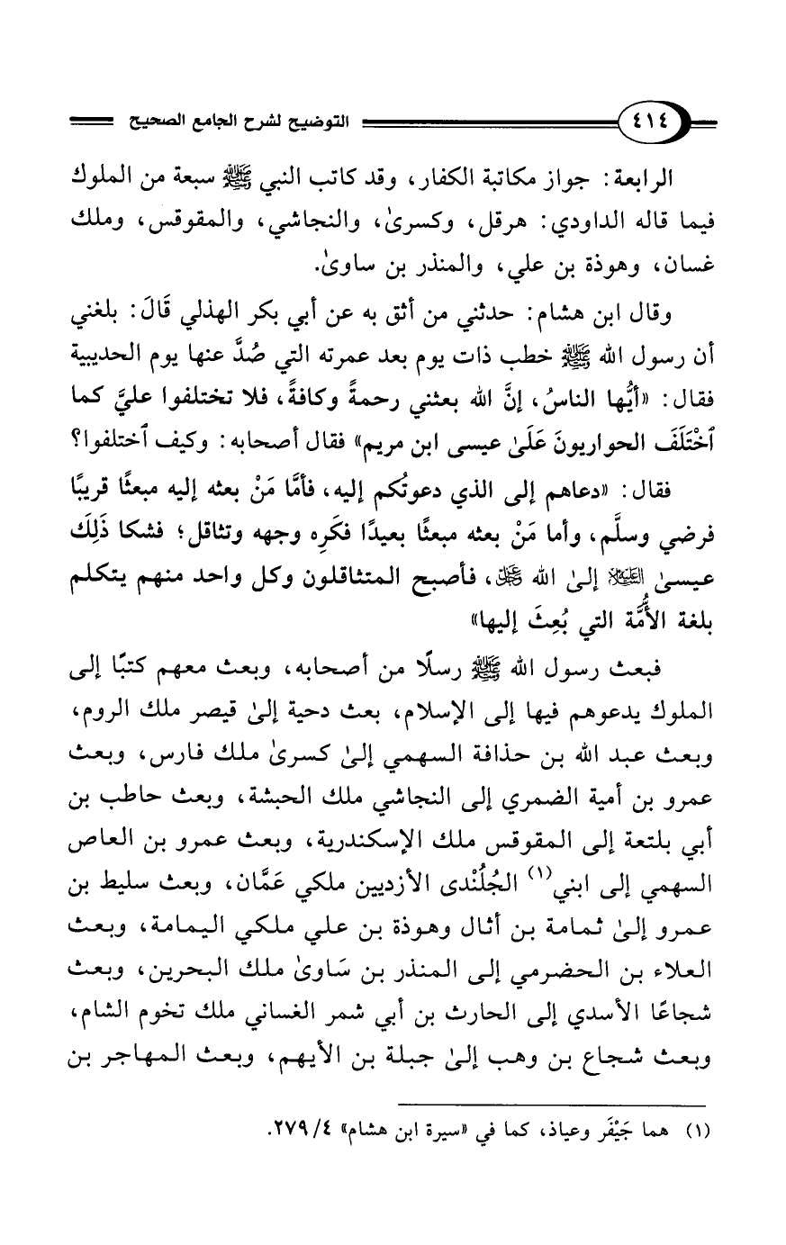 الرابعة: جواز مكاتبة الكفار، وقد كاتب النبي - صلى الله عليه وسلم - سبعة من الملوك فيما قاله الداودي: هرقل، وكسرى، والنجاشي، والمقوقس، وملك غسان، وهوذة بن علي، والمنذر بن ساوى.