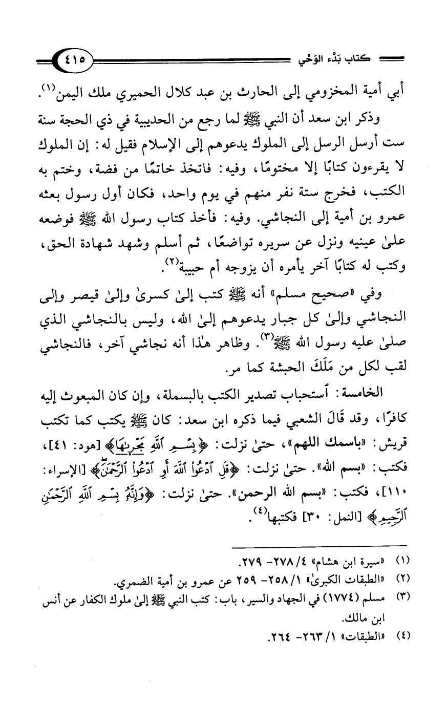 الخامسة: استحباب تصدير الكتب بالبسملة، وإن كان المبعوث إليه كافرًا، وقد قَالَ الشعبي فيما ذكره ابن سعد: كان - صلى الله عليه وسلم - يكتب كما تكتب قريش: "باسمك اللهم"، حتى نزلت: {بِسْمِ اللهِ مَجْرَاهَا} [هود: 41]، فكتب: "بسم الله". حتى نزلت: {قُلِ ادْعُوا اللَّهَ أَوِ ادْعُوا الرَّحْمَنَ} [الإسراء: 110]: 110]، فكتب: "بسم الله الرحمن". حتى نزلت: {وَإِنَّهُ بِسْمِ اللهِ الرَّحْمَنِ الرَّحِيمِ} [النمل: 30] فكتبها (¬4).