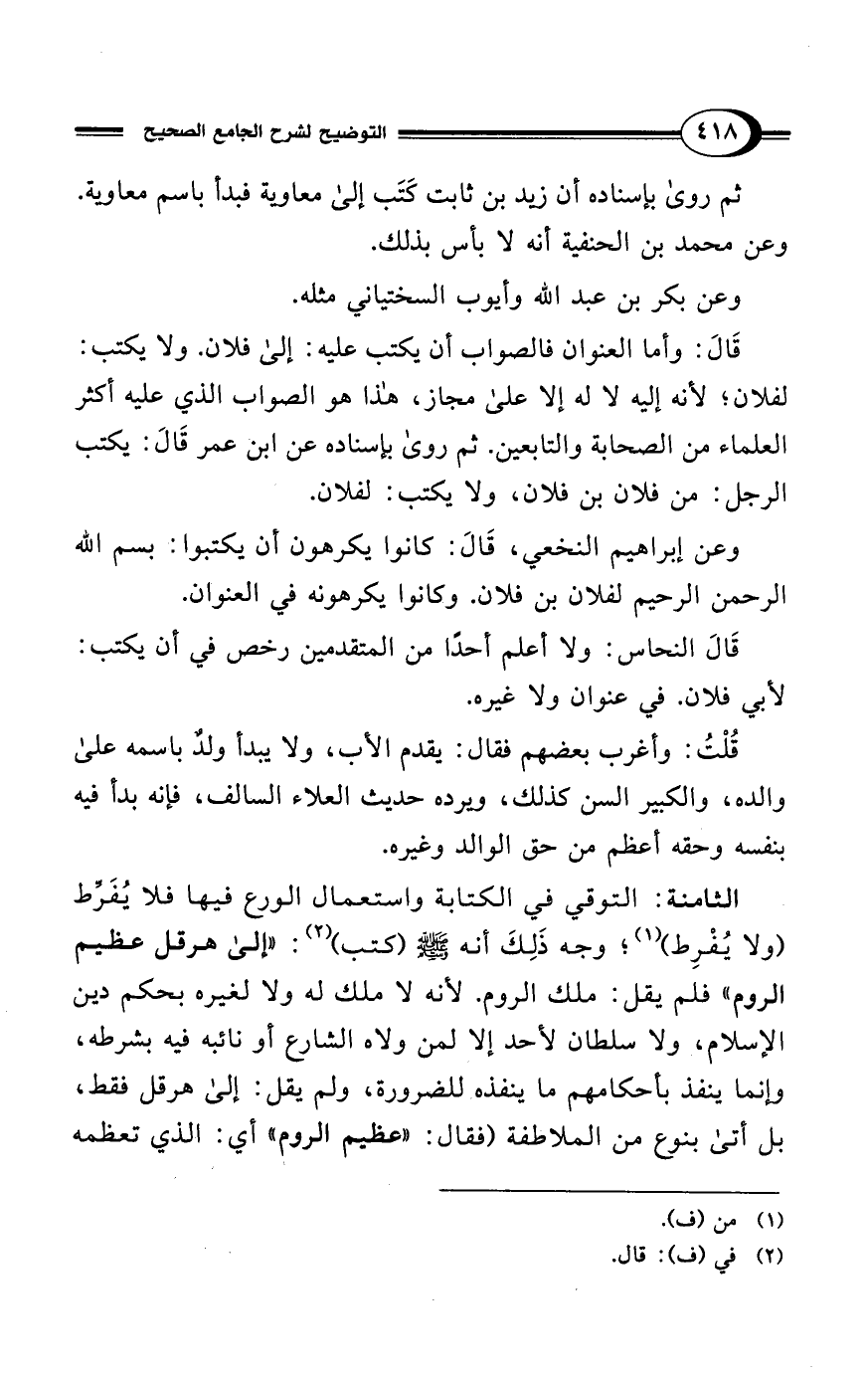 قَالَ: وأما العنوان فالصواب أن يكتب عليه: إلى فلان. ولا يكتب: لفلان؛ لأنه إليه لا له إلا على مجاز، هذا هو الصواب الذي عليه أكثر العلماء من الصحابة والتابعين. ثم روى بإسناده عن ابن عمر قَالَ: يكتب الرجل: من فلان بن فلان، ولا يكتب: لفلان.