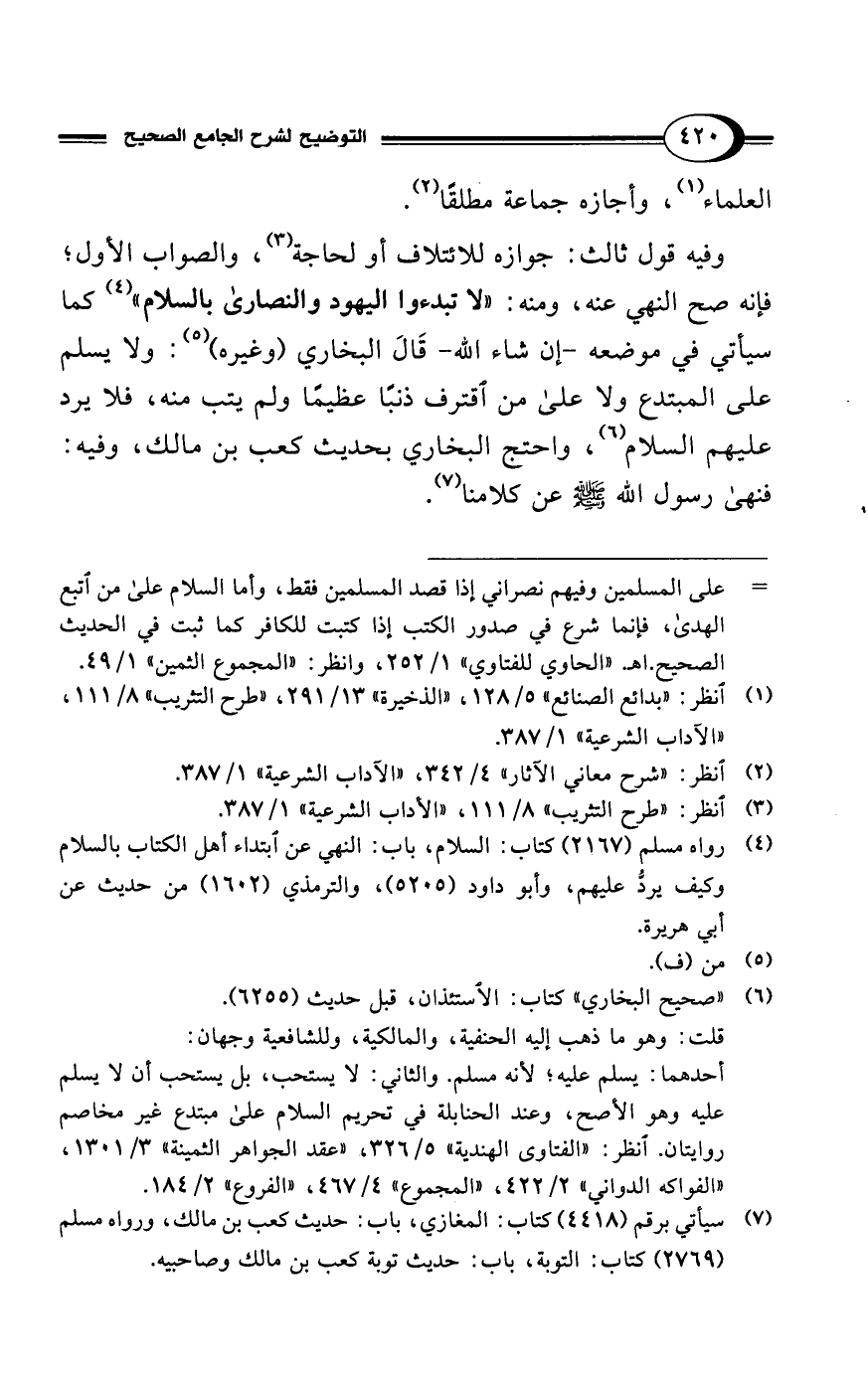 وفيه قول ثالث: جوازه للائتلاف أو لحاجة (¬3)، والصواب الأول؛ فإنه صح النهي عنه، ومنه: "لا تبدءوا اليهود والنصارى بالسلام" (¬4) كما سيأتي في موضعه -إن شاء الله- قَالَ البخاري (وغيره) (¬5): ولا يسلم على المبتدع ولا على من اقترف ذنبًا عظيمًا ولم يتب منه، فلا يرد عليهم السلام (¬6)، واحتج البخاري بحديث كعب بن مالك، وفيه: فنهى رسول الله - صلى الله عليه وسلم - عن كلامنا (¬7).