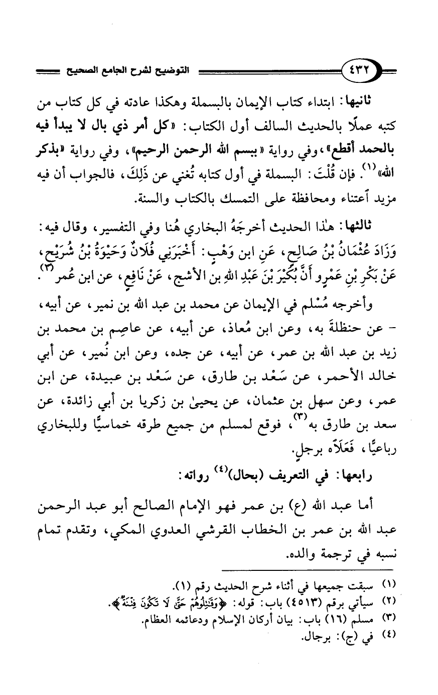 ثانيها: ابتداء كتاب الإيمان بالبسملة وهكذا عادته في كل كتاب من كتبه عملًا بالحديث السالف أول الكتاب: "كل أمر ذي بال لا يبدأ فيه بالحمد أقطع"، وفي رواية "ببسم الله الرحمن الرحيم"، وفي رواية "بذكر الله" (¬1). فإن قُلْتَ: البسملة في أول كتابه تُغني عن ذَلِكَ، فالجواب أن فيه مزيد اعتناء ومحافظة على التمسك بالكتاب والسنة.