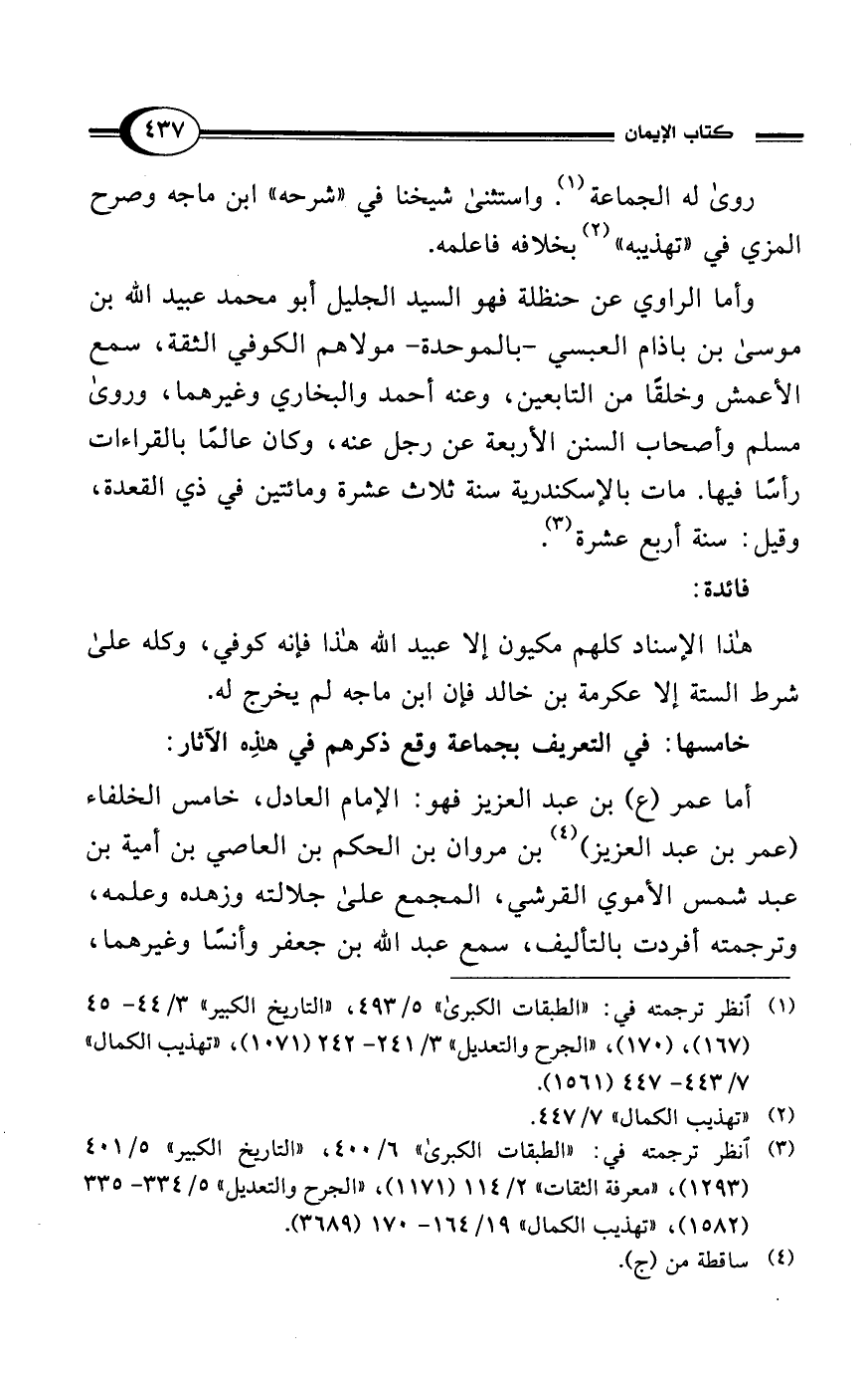 وأما الراوي عن حنظلة فهو السيد الجليل أبو محمد عبيد الله بن موسى بن باذام العبسي -بالموحدة- مولاهم الكوفي الثقة، سمع الأعمش وخلقًا من التابعين، وعنه أحمد والبخاري وغيرهما، وروى مسلم وأصحاب السنن الأربعة عن رجل عنه، وكان عالمًا بالقراءات رأسًا فيها. مات بالإسكندرية سنة ثلاث عشرة ومائتين في ذي القعدة، وقيل: سنة أربع عشرة (¬3).