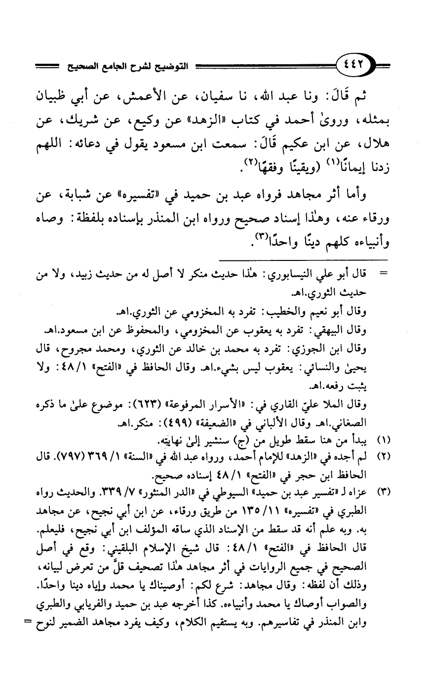 ثم قَالَ: ونا عبد الله، نا سفيان، عن الأعمش، عن أبي ظبيان بمثله، وروى أحمد في كتاب "الزهد" عن وكيع، عن شريك، عن هلال، عن ابن عكيم قَالَ: سمعت ابن مسعود يقول في دعائه: اللهم زدنا إيمانًا (¬1) (ويقينًا وفقهًا (¬2).