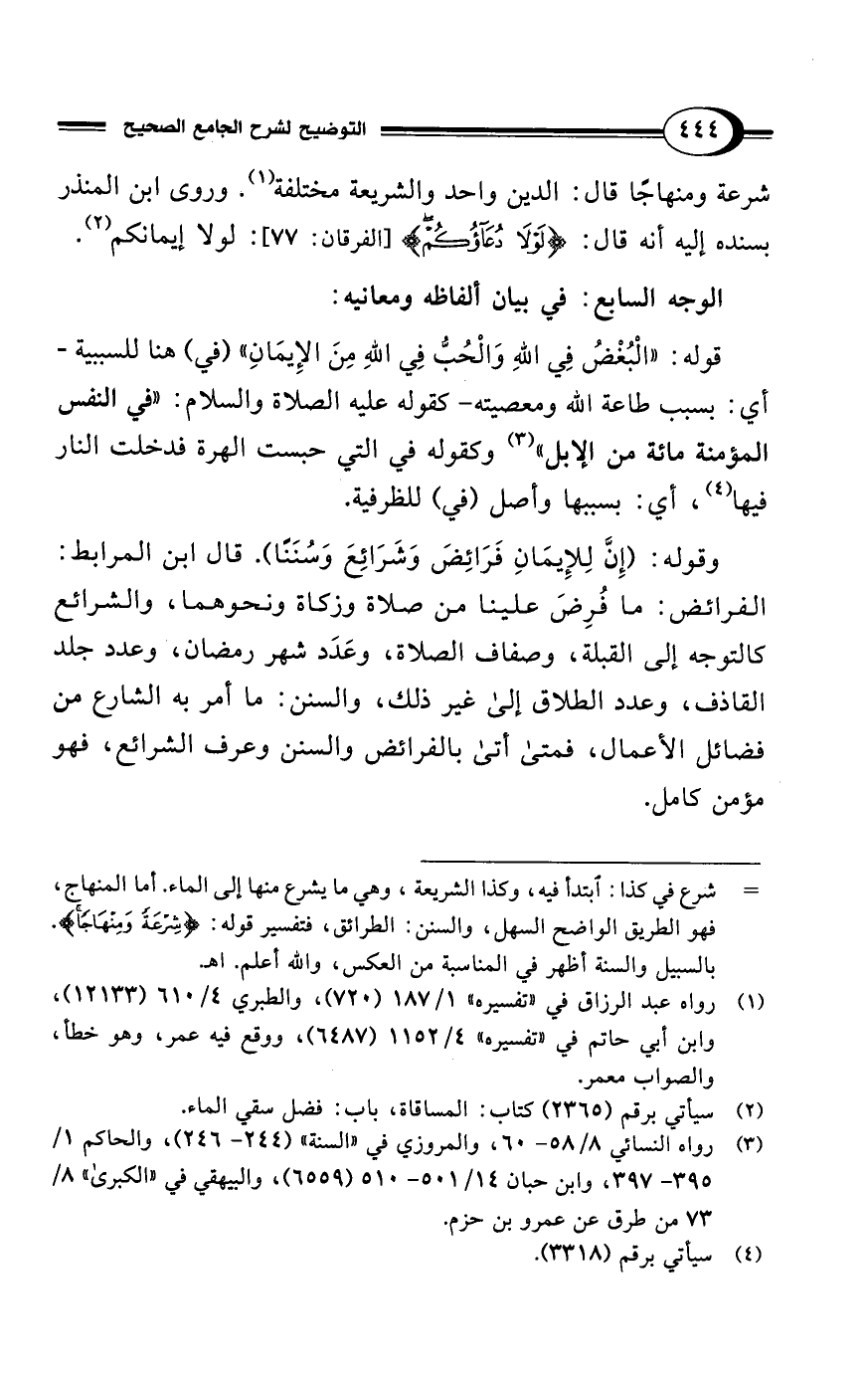 قوله: "الْبُغْضُ فِي اللهِ وَالْحُبُّ فِي اللهِ مِنَ الإِيمَانِ" (في) هنا للسببية -أي: بسبب طاعة الله ومعصيته- كقوله عليه الصلاة والسلام: "في النفس المؤمنة مائة من الابل" (¬3) وكقوله في التي حبست الهرة فدخلت النار فيها (¬4)، أي: بسببها وأصل (في) للظرفية.