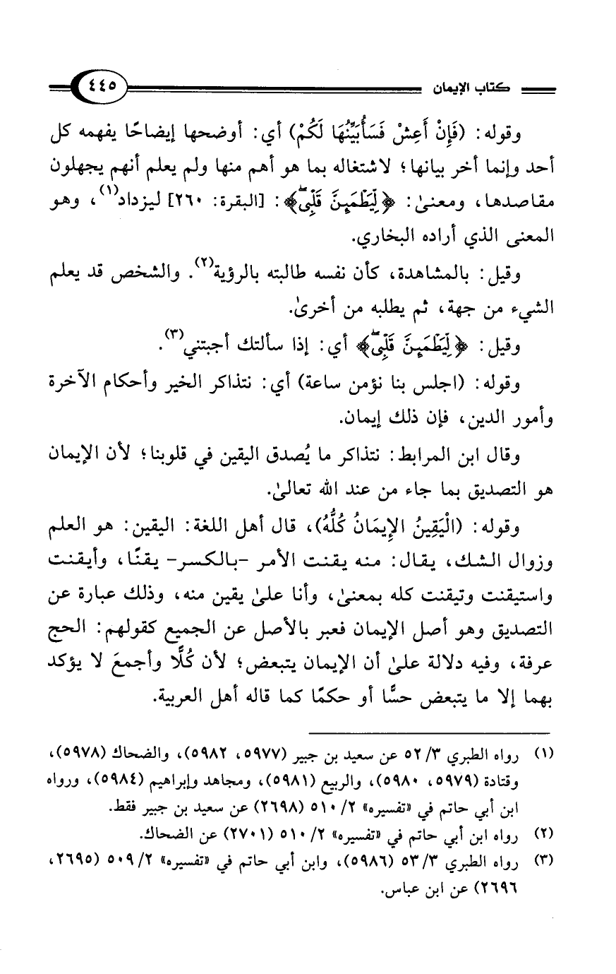 وقوله: (الْيَقِينُ الإِيمَانُ كُلُّهُ)، قال أهل اللغة: اليقين: هو العلم وزوال الشك، يقال: منه يقنت الأمر -بالكسر- يقنًا، وأيقنت واستيقنت وتيقنت كله بمعنى، وأنا على يقين منه، وذلك عبارة عن التصديق وهو أصل الإيمان فعبر بالأصل عن الجميع كقولهم: الحج عرفة، وفيه دلالة على أن الإيمان يتبعض؛ لأن كُلًّا وأجمعَ لا يؤكد بهما إلا ما يتبعض حسًّا أو حكمًا كما قاله أهل العربية.