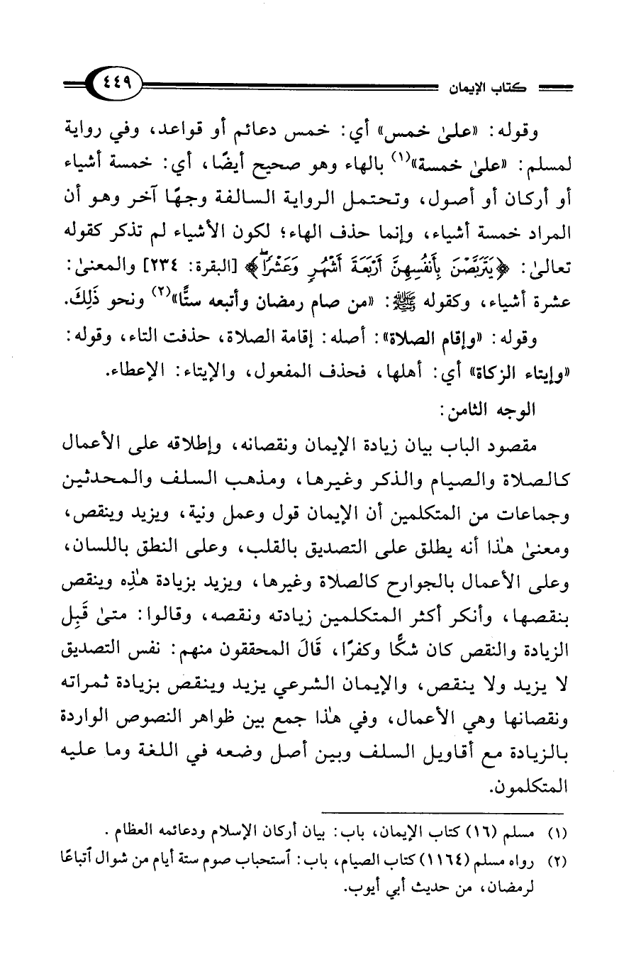 مقصود الباب بيان زيادة الإيمان ونقصانه، وإطلاقه على الأعمال كالصلاة والصيام والذكر وغيرها، ومذهب السلف والمحدثين وجماعات من المتكلمين أن الإيمان قول وعمل ونية، ويزيد وينقص، ومعنى هذا أنه يطلق على التصديق بالقلب، وعلى النطق باللسان، وعلى الأعمال بالجوارح كالصلاة وغيرها، ويزيد بزيادة هذِه وينقص بنقصها، وأنكر أكثر المتكلمين زيادته ونقصه، وقالوا: متى قَبِل الزيادة والنقص كان شكًّا وكفرًا، قَالَ المحققون منهم: نفس التصديق لا يزيد ولا ينقص، والإيمان الشرعي يزيد وينقص بزيادة ثمراته ونقصانها وهي الأعمال، وفي هذا جمع بين ظواهر النصوص الواردة بالزيادة مع أقاويل السلف وبين أصل وضعه في اللغة وما عليه المتكلمون.