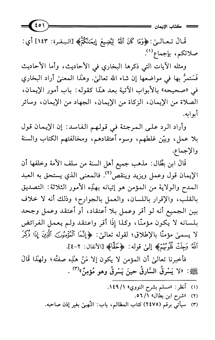 قَالَ ابن بطَّال: مذهب جميع أهل السنة من سلف الأمة وخلفها أن الإيمان قول وعمل ويزيد وينقص (¬2). فالمعنى الذي يستحق به العبد المدح والولاية من المؤمن هو إتيانه بهذِه الأمور الثلاثة: التصديق بالقلب، والإقرار باللسان، والعمل بالجوارح؛ وذلك أنه لا خلاف بين الجميع أنه لو أقر وعمل بلا اعتقاد، أو اعتقد وعمل وجحد بلسانه لا يكون مؤمنًا، وكذا إِذَا أقر واعتقد ولم يعمل الفرائض لا يسمى مؤمنًا بالإطلاق؛ لقوله تعالى: {إِنَّمَا الْمُؤْمِنُونَ الَّذِينَ إِذَا ذُكِرَ اللهُ وَجِلَتْ قُلُوبُهُمْ} إلى قوله: {حَقًّا} [الأنفال: 2 - 4].