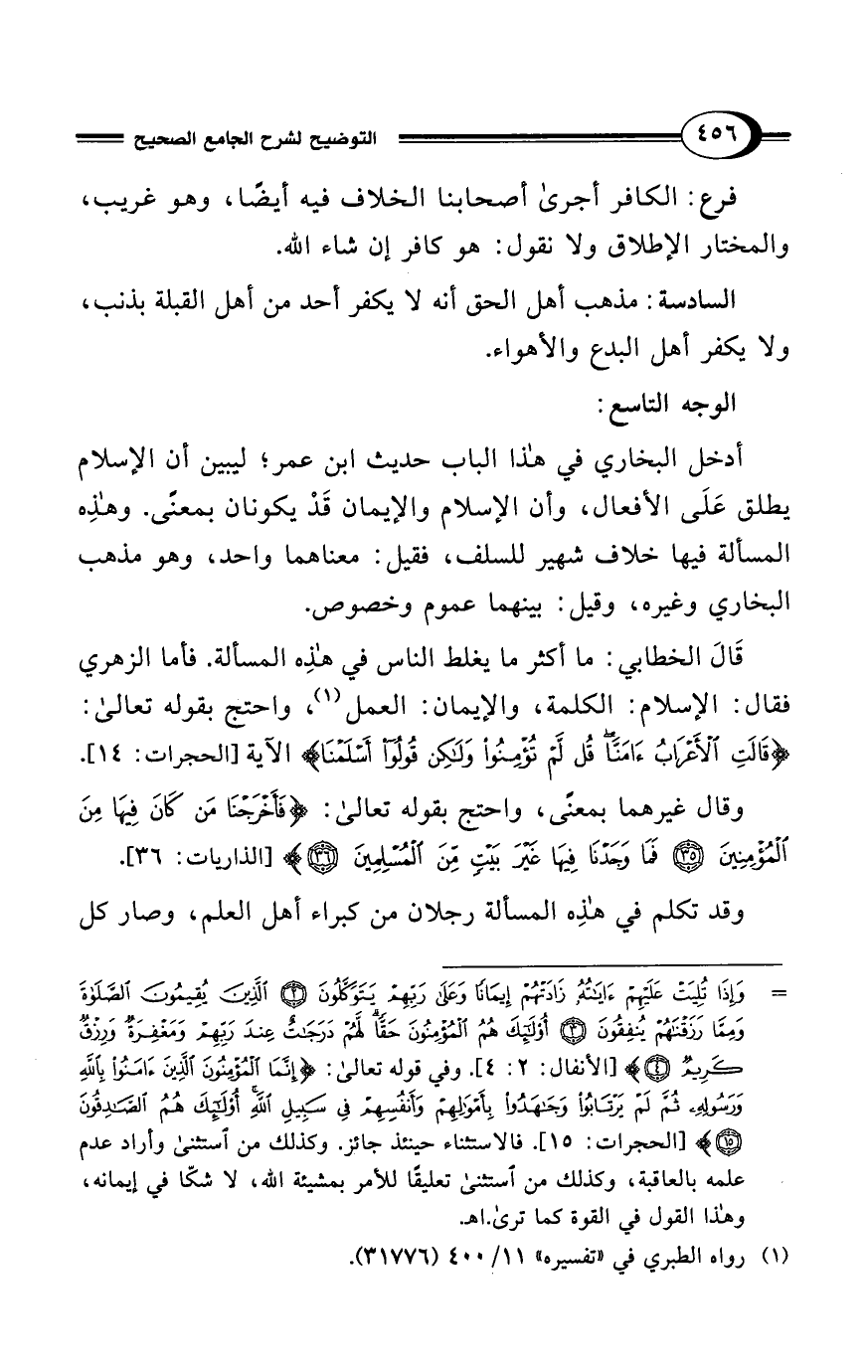 = وَإِذَا تُلِيَتْ عَلَيْهِمْ آيَاتُهُ زَادَتْهُمْ إِيمَانًا وَعَلَى رَبِّهِمْ يَتَوَكَّلُونَ (2) الَّذِينَ يُقِيمُونَ الصَّلَاةَ وَمِمَّا رَزَقْنَاهُمْ يُنْفِقُونَ (3) أُولَئِكَ هُمُ الْمُؤْمِنُونَ حَقًّا لَهُمْ دَرَجَاتٌ عِنْدَ رَبِّهِمْ وَمَغْفِرَةٌ وَرِزْقٌ كَرِيمٌ (4)} [الأنفال: 2: 4] وفي قوله تعالى: {إِنَّمَا الْمُؤْمِنُونَ الَّذِينَ آمَنُوا بِاللهِ وَرَسُولِهِ ثُمَّ لَمْ يَرْتَابُوا وَجَاهَدُوا بِأَمْوَالِهِمْ وَأَنْفُسِهِمْ فِي سَبِيلِ اللهِ أُولَئِكَ هُمُ الصَّادِقُونَ (15)} [الحجرات: 15]. فالاستثناء حينئذ جائز. وكذلك من استثنى وأراد عدم علمه بالعاقبة، وكذلك من استثنى تعليقًا للأمر بمشيئة الله، لا شكّا في إيمانه، وهذا القول في القوة كما ترى. اهـ.