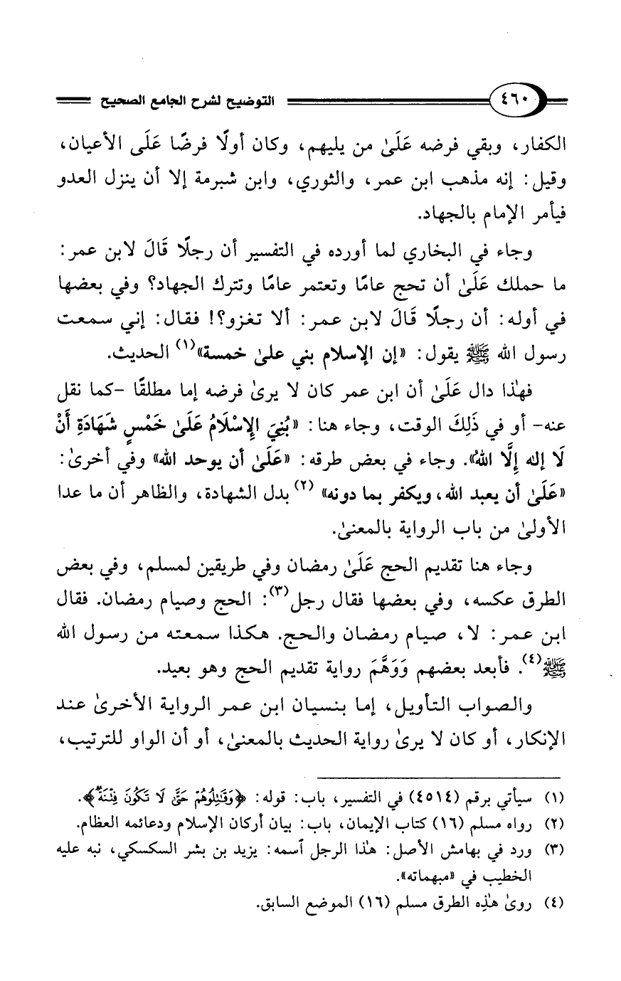فهذا دال عَلَى أن ابن عمر كان لا يرى فرضه إما مطلقًا -كما نقل عنه- أو في ذَلِكَ الوقت، وجاء هنا: "بُنِيَ الإِسْلَامُ عَلَى خَمْسٍ شَهَادَةِ أَنْ لَا إله إِلَّا اللهُ". وجاء في بعض طرقه: "عَلَى أن يوحد الله" وفي أخرى: "على أن يعبد الله، ويكفر بما دونه" (¬2) بدل الشهادة، والظاهر أن ما عدا الأولى من باب الرواية بالمعنى.