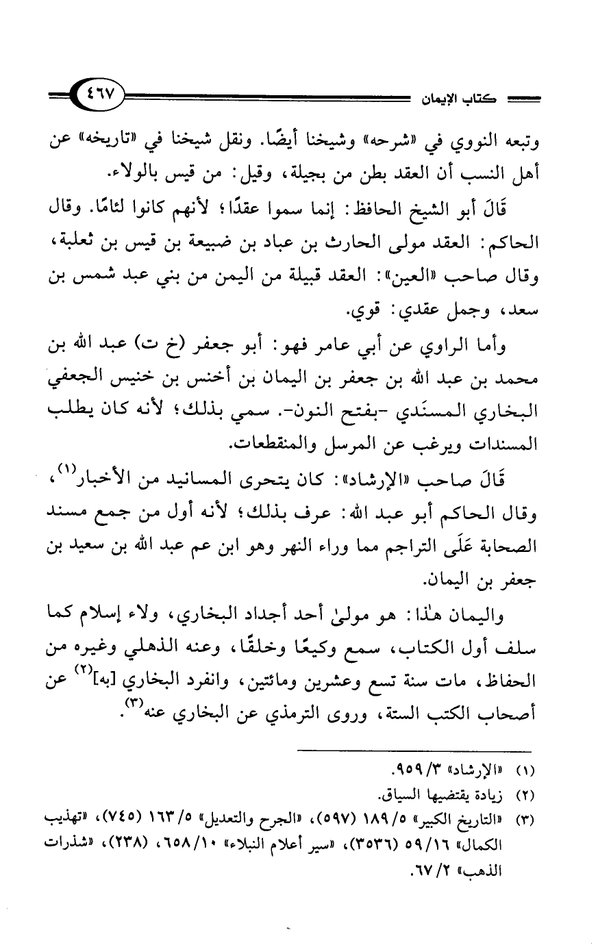 قَالَ صاحب "الإرشاد": كان يتحرى المسانيد من الأخبار (¬1)، وقال الحاكم أبو عبد الله: عرف بذلك؛ لأنه أول من جمع مسند الصحابة عَلَى التراجم مما وراء النهر وهو ابن عم عبد الله بن سعيد بن جعفر بن اليمان.
