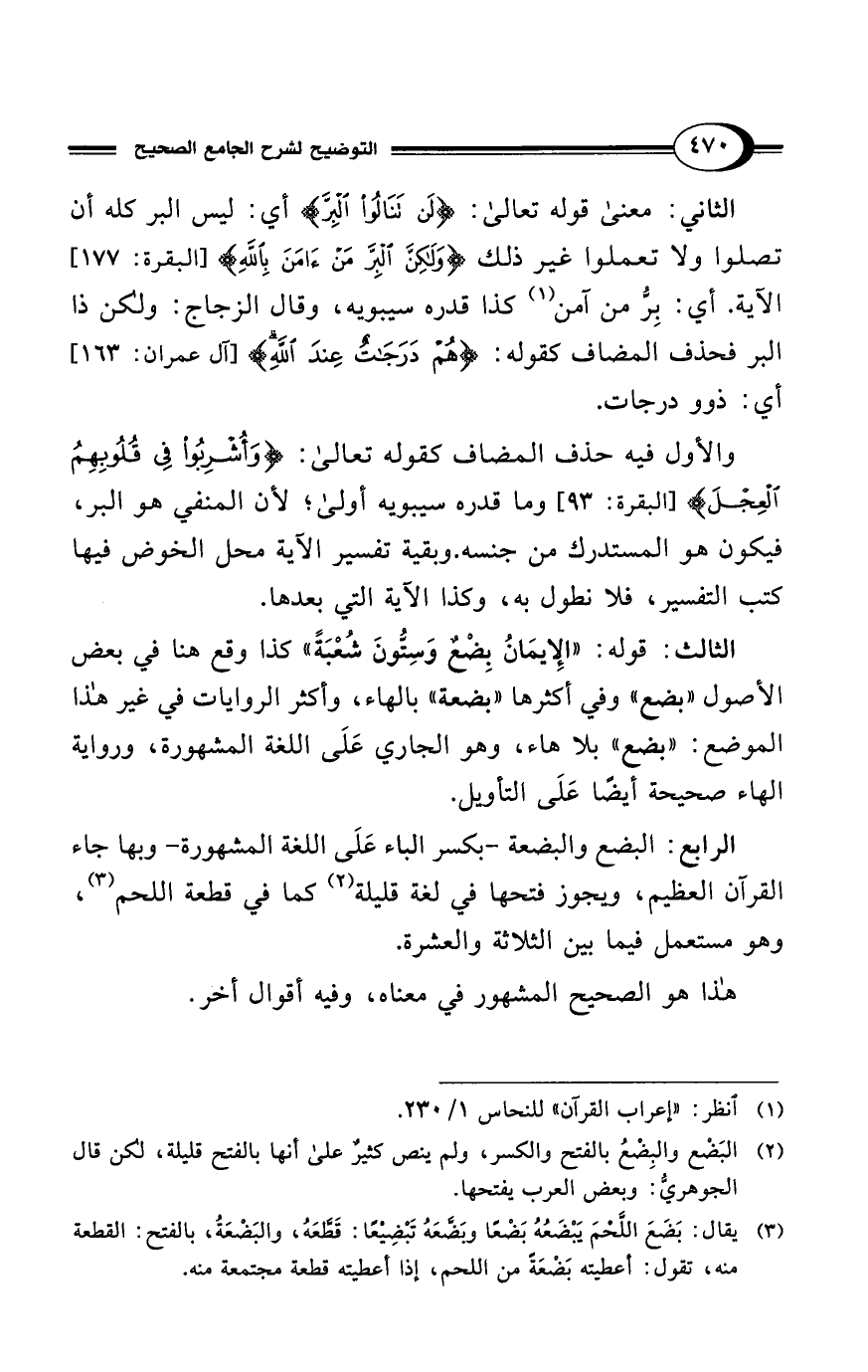 والأول فيه حذف المضاف كقوله تعالى: {وَأُشْرِبُوا فِي قُلُوبِهِمُ الْعِجْلَ} [البقرة: 93]، وما قدره سيبويه أولى؛ لأن المنفي هو البر، فيكون هو المستدرك من جنسه. وبقية تفسير الآية محل الخوض فيها كتب التفسير، فلا نطول به، وكذا الآية التي بعدها.