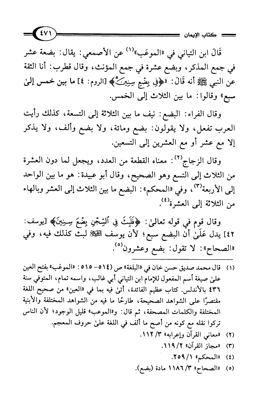 قَالَ ابن التياني في "الموعَب" (¬1) عن الأصمعي: يقال: بضعة عشر في جمع المذكر، وبضع عشرة في جمع المؤنث، وقال قطرب: أنا الثقة عن النبي - صلى الله عليه وسلم - أنه قَالَ: " {فِي بِضْعِ سِنِينَ} [الروم: 4] ما بين خمس إلى سبع" وقالوا: ما بين الثلاث إلى الخمس.